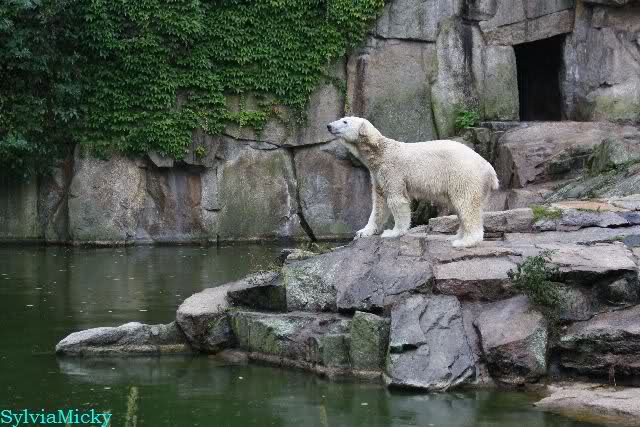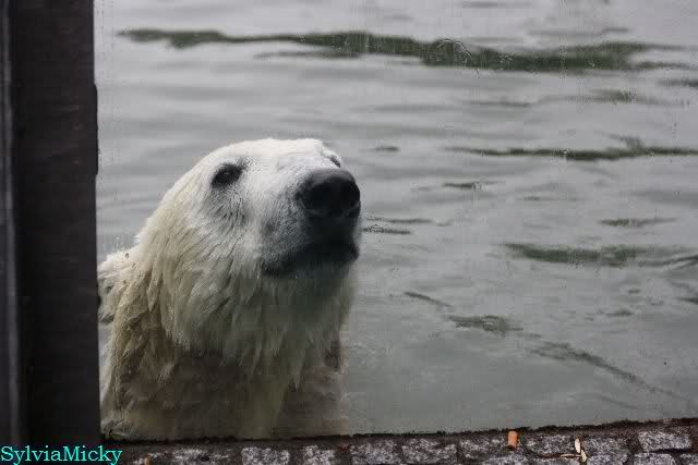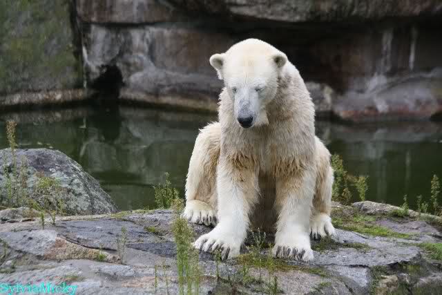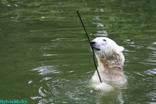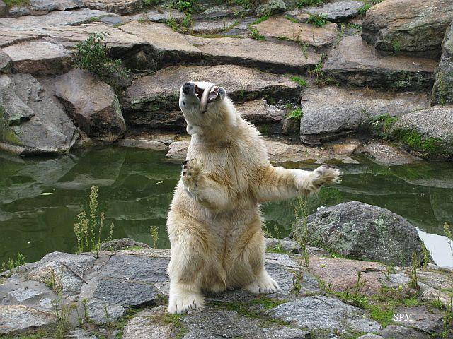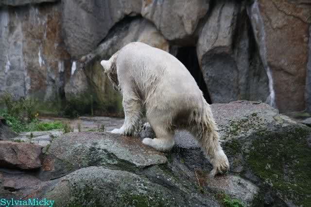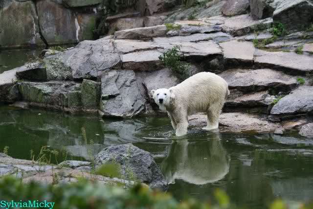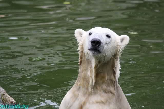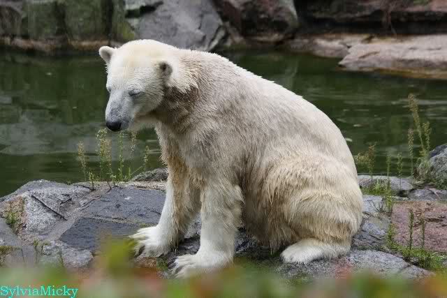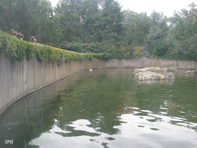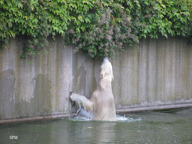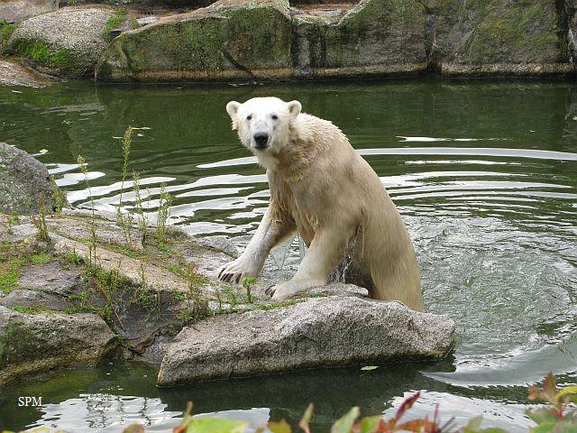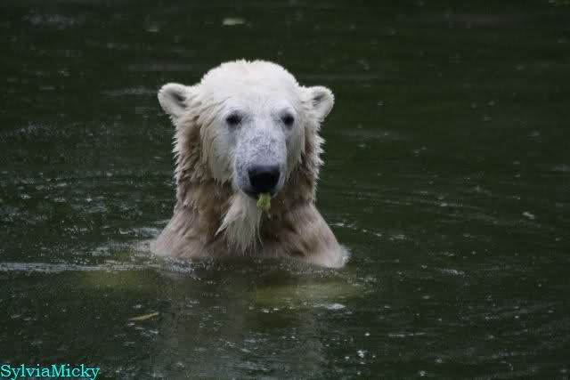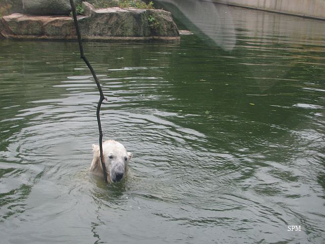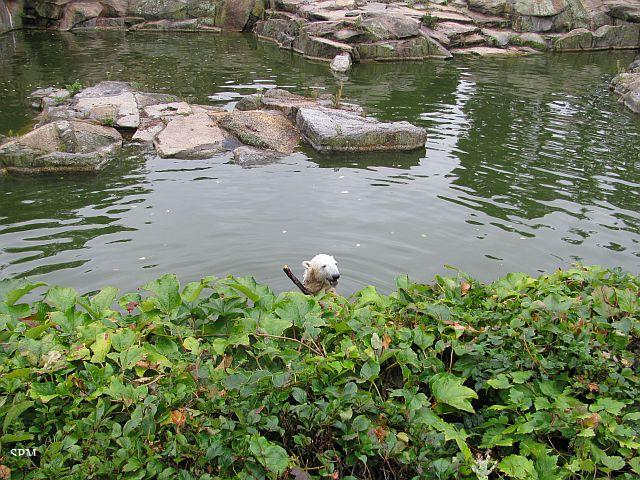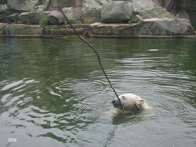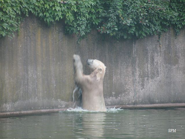 Bei strömenden Regen hielt sich Knut von neun bis halb zwei im Wasser auf, nur unterbrochen durch zwei kurze Gänge auf die Anlage. Wobei alle Eingänge kurz inspiziert wurden. Er spielte mit Zweigen, sprang an der Mauer hoch, um an Zweige zu kommen und betrachtete ausgiebig die Besucher. Als er gegen halb zwei auf die Mittelinsel ging (ohne Schwierigkeiten), fielen ihm im Sitzen die Augen zu.