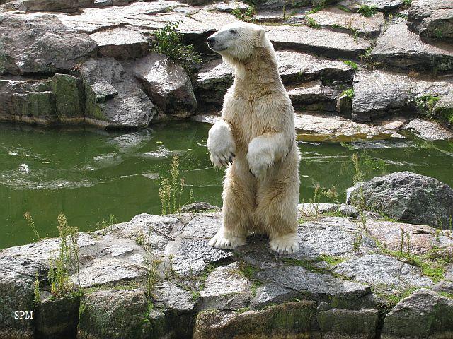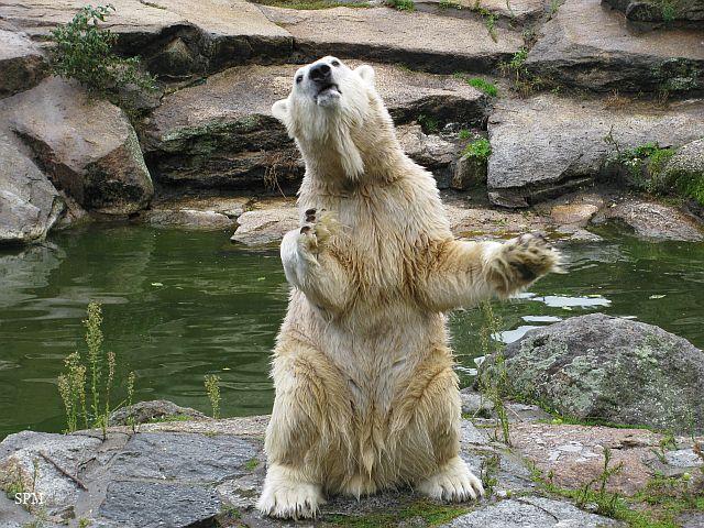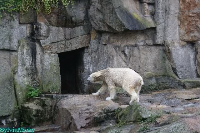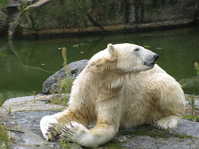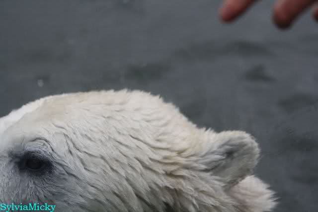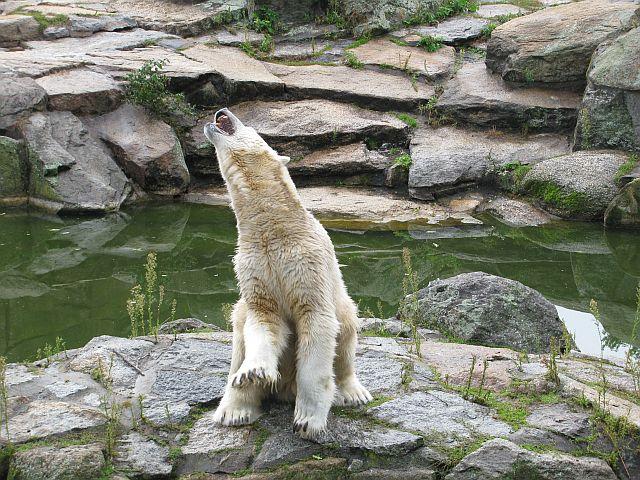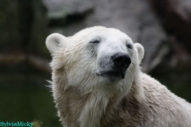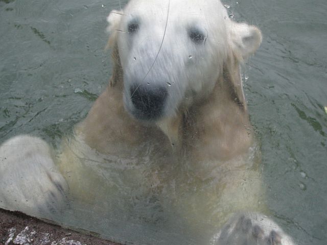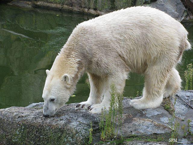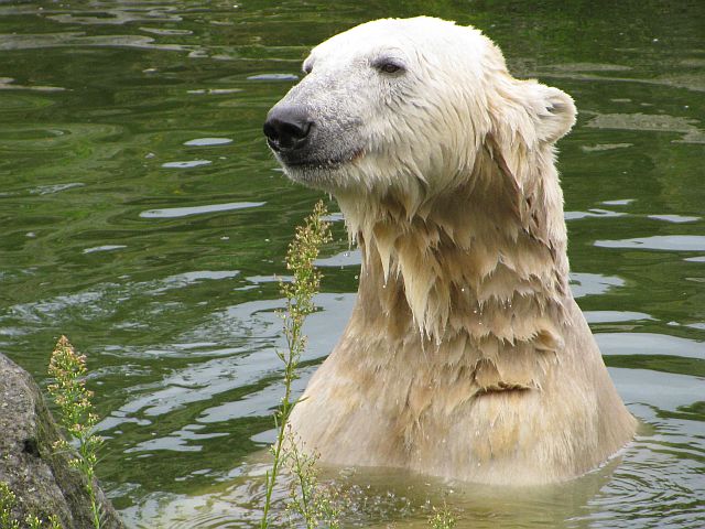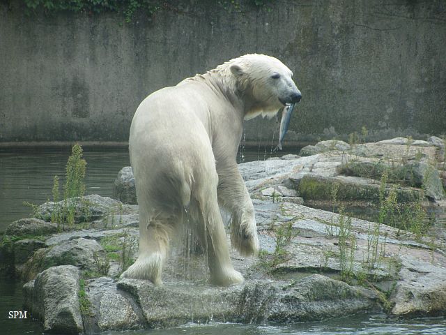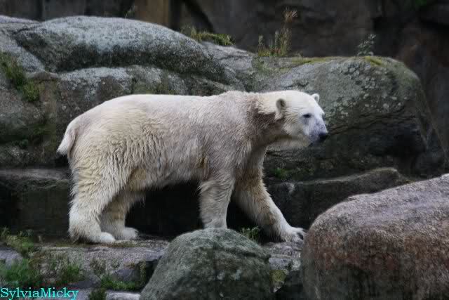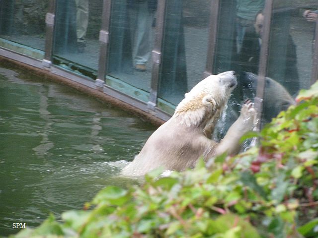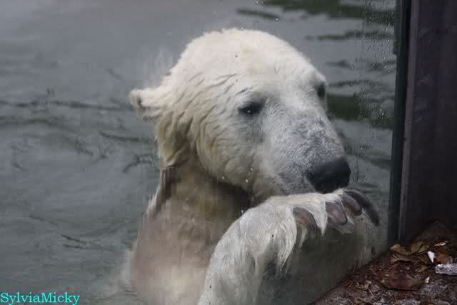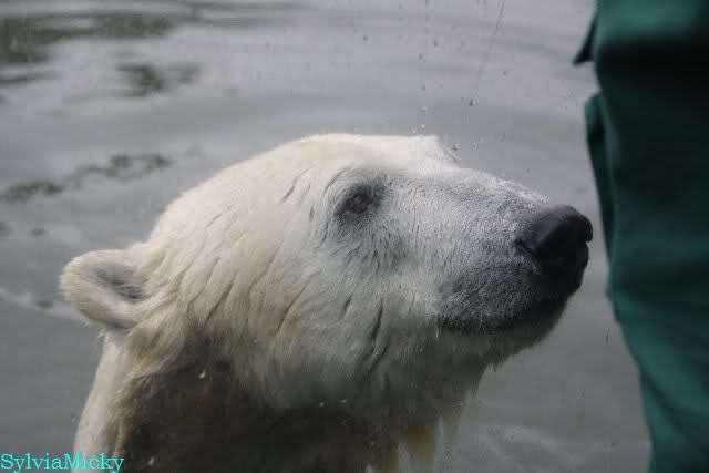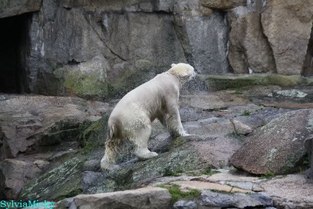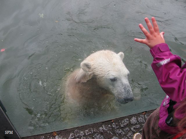 Bei strömenden Regen hielt sich Knut von neun bis halb zwei im Wasser auf, nur unterbrochen durch zwei kurze Gänge auf die Anlage. Wobei alle Eingänge kurz inspiziert wurden. Er spielte mit Zweigen, sprang an der Mauer hoch, um an Zweige zu kommen und betrachtete ausgiebig die Besucher. Als er gegen halb zwei auf die Mittelinsel ging (ohne Schwierigkeiten), fielen ihm im Sitzen die Augen zu.