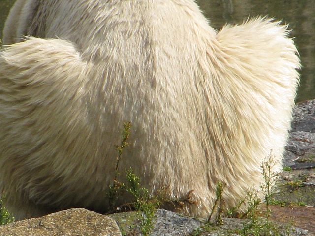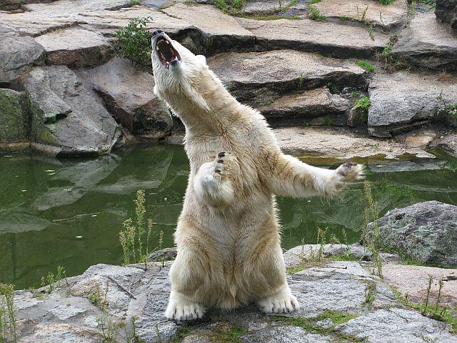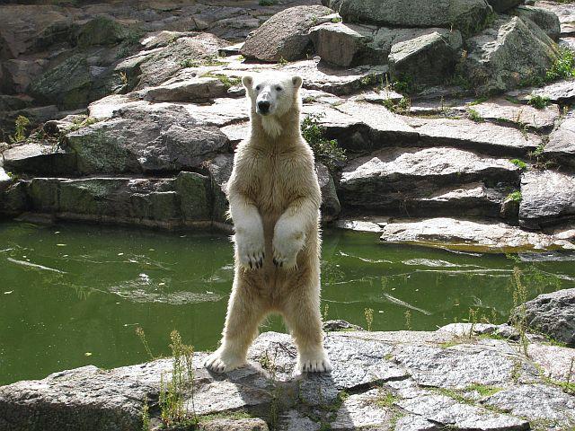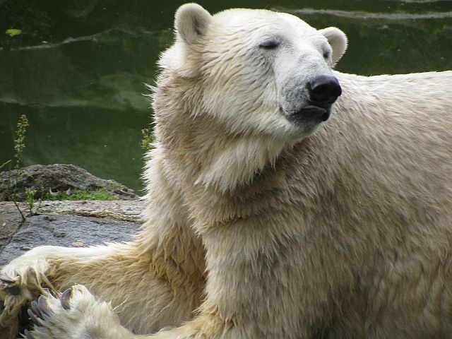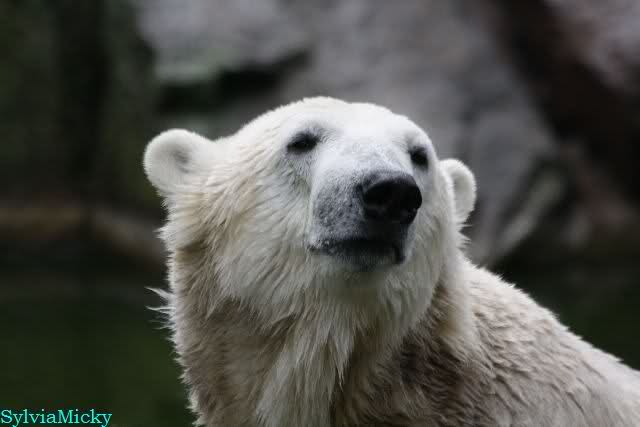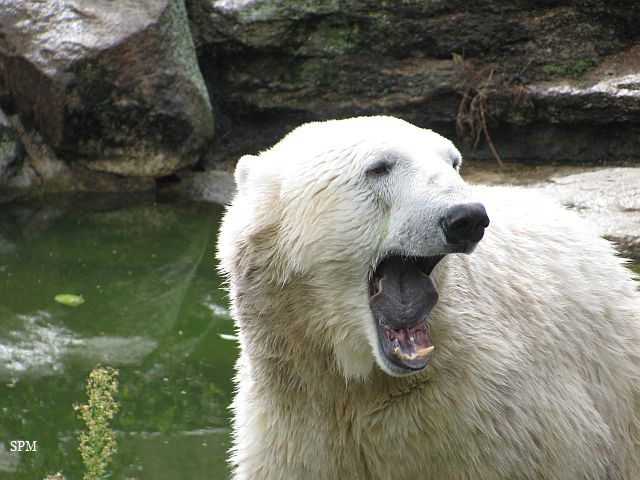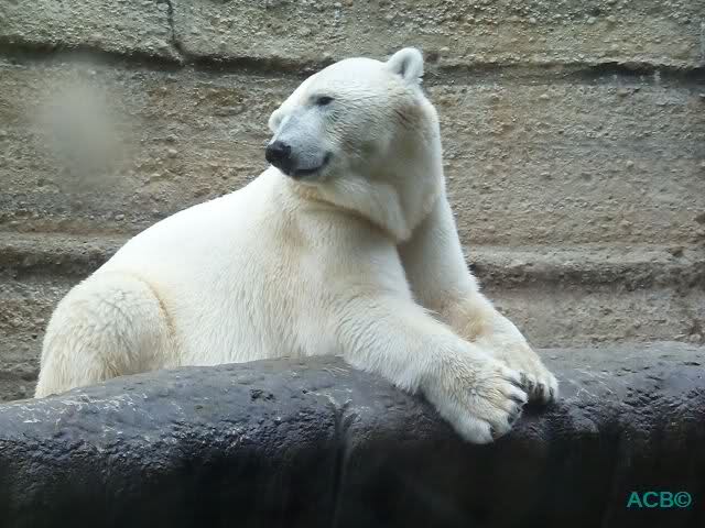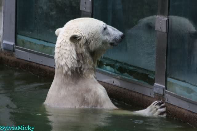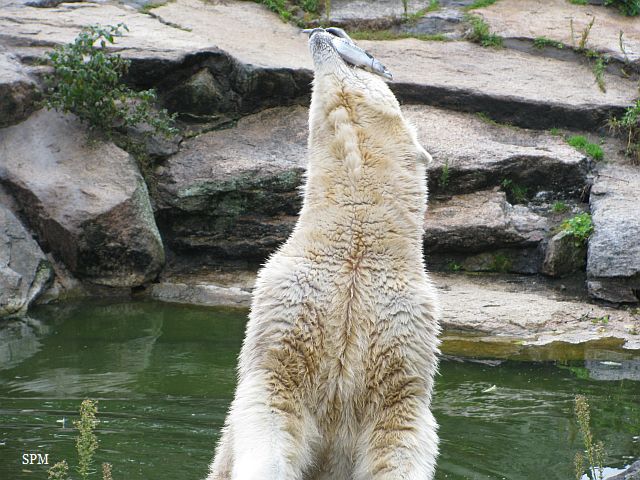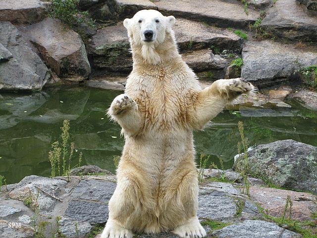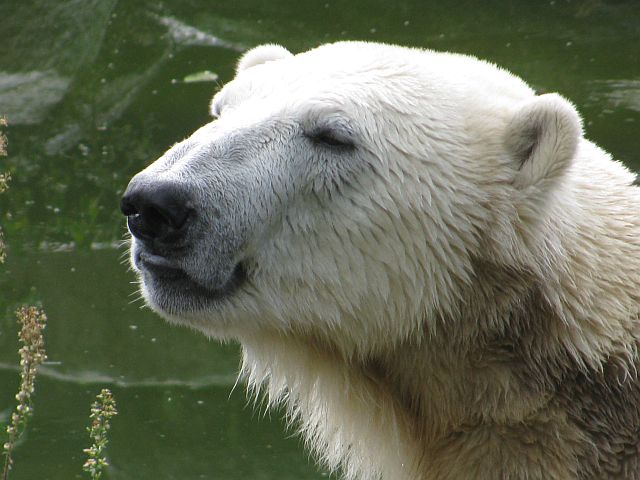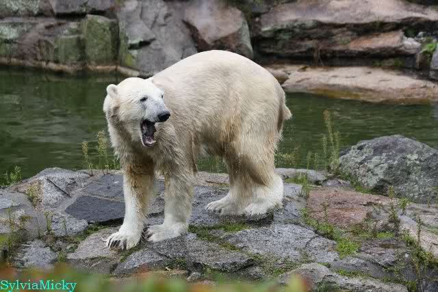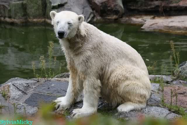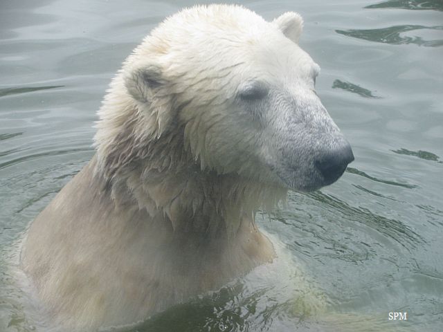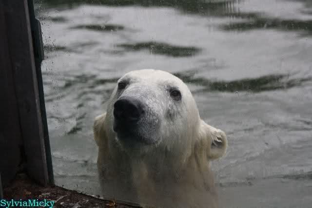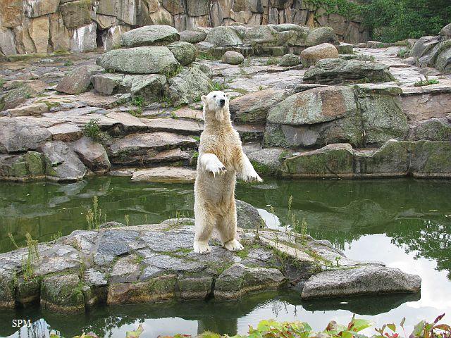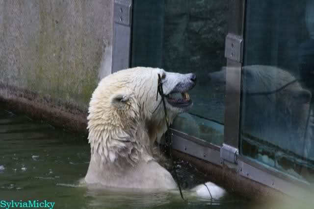 Bei strömenden Regen hielt sich Knut von neun bis halb zwei im Wasser auf, nur unterbrochen durch zwei kurze Gänge auf die Anlage. Wobei alle Eingänge kurz inspiziert wurden. Er spielte mit Zweigen, sprang an der Mauer hoch, um an Zweige zu kommen und betrachtete ausgiebig die Besucher. Als er gegen halb zwei auf die Mittelinsel ging (ohne Schwierigkeiten), fielen ihm im Sitzen die Augen zu.