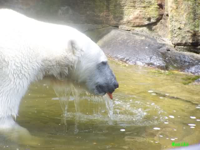 Langsam schlenderte ich wieder zu Knut zurück. Der war erwacht und spielte im Wasser, allerdings hinter der Biegung zum Bärenhof hin. Nach einer Weile begann Knut wieder zu laufen, leider. Das sehe ich nicht so gern. Aber wirklich gern sehe ich dagegen die Nasenbärenfütterung. Deshalb seilte ich mich ab.