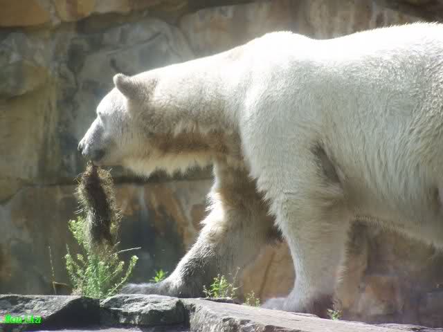 Die Fütterung machte heute Herr Röbke. Zuerst gab es Gulasch. Das heißt, das Fleisch war in ziemlich kleine Stücke geschnitten. Den Bären war´s egal. Sie machten Jagd auf jedes Stück Fleisch, egal ob groß oder klein. Mir fiel heute wieder auf, was Lars für ein wunderschöner Bärenmann ist. Wenn er nass ist, sieht man unter seinem Fell das Spiel seiner beeindruckenden Muskeln. Und dann diese mächtigen Tatzen! Dieser Bär ist außerordentlich schön und beeindruckend. Aber Knut wird mit Sicherheit noch schöner.