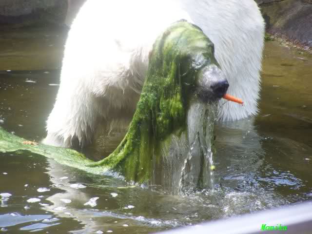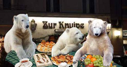 Als die Braunbären gefüttert wurden, sicherte sich Petzi einen Salatkopf. Als ein neugieriger Wolf herankam, brummte sie ihn böse an. Das war ihr Salatkopf! Bedächtig futterte sie ihn auf. Dieses Beispiel scheint bei Knut noch nicht angekommen zu sein.