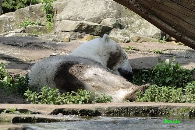 Heute morgen hat Knut noch geschlafen und Gianna lief ihre Morgenrunde. Anschließend legte sie sich neben Knut. Sie robbte sich immer dichter heran. Sie schliefen eine ganze Weile ziemlich dicht nebeneinander. Ein schöner Anblick. Als es mal wieder Zoff bei den Braunbären gab, stand sie auf und ging ins Wasser. Einige Minuten später ging auch Knut ins Wasser und sie tobten gemeinsam.