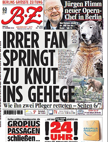 Im Zoologischen Garten Berlin ist am Montag ein 37-jähriger Mann in das Gehege von Eisbär Knut gesprungen. Der aus Cottbus stammende Zoo-Besucher erlitt keine Verletzungen. Laut Polizei gab der Mann später an, er habe vor dem Gehege das Gefühl gehabt, der Bär sei traurig und einsam.