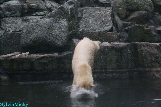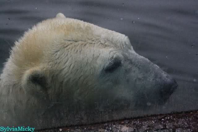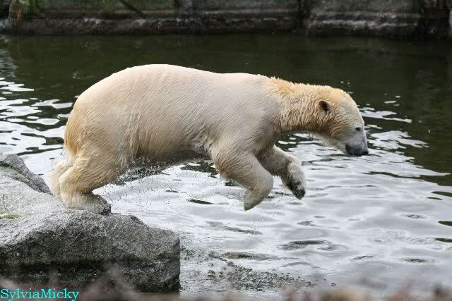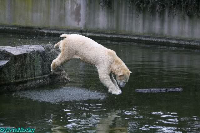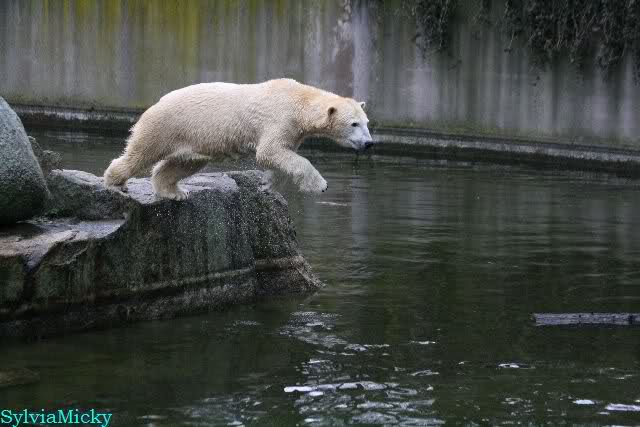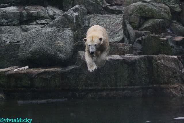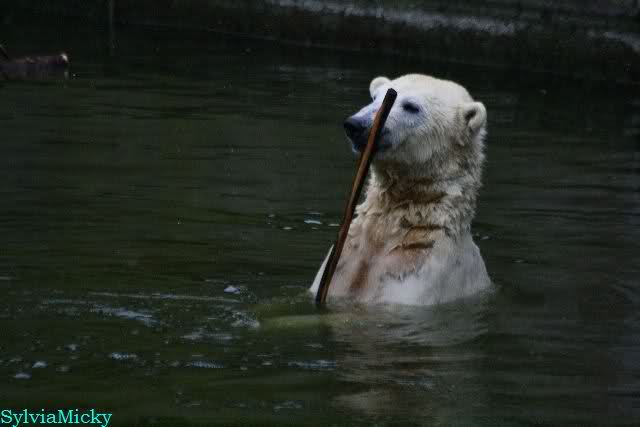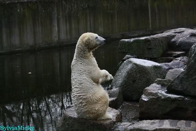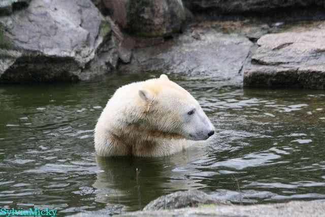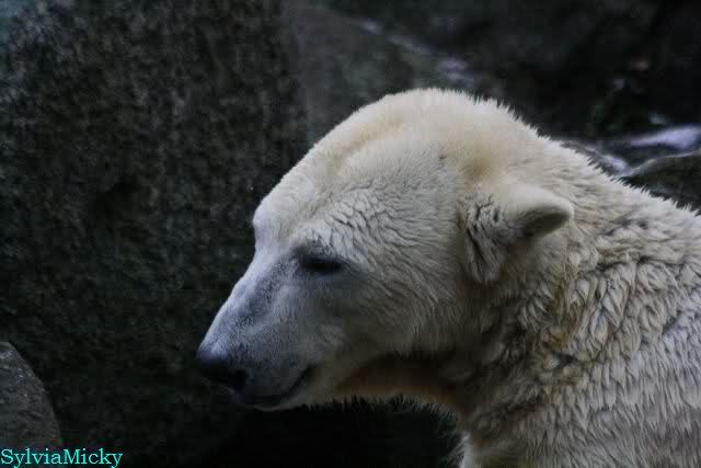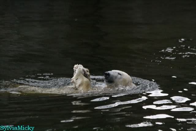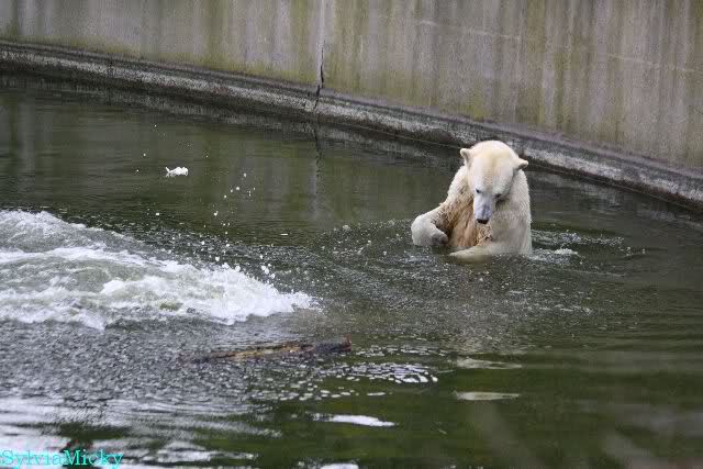 Endlich wieder eine Weile bei Knut. Natürlich hatte er aufgehört zu spielen bis ich endlich zum Gehege kam. Jessie hat noch einige Minuten erlebt. Auf jeden Fall war es gut die Viererbande wiederzusehen. Zerrupft Knut jetzt auch mit den Stanzlöchern im Fell aussieht, ist er noch immer der schönste Eisbär der Welt und wird es auch immer bleiben.