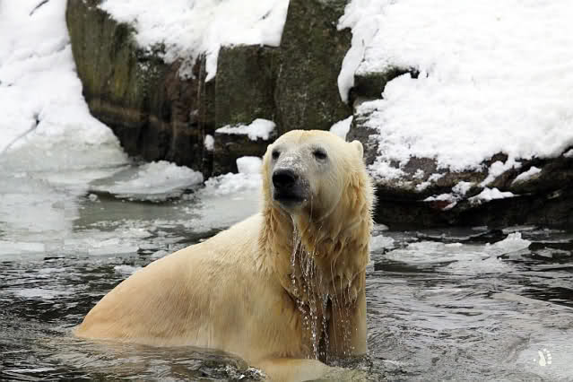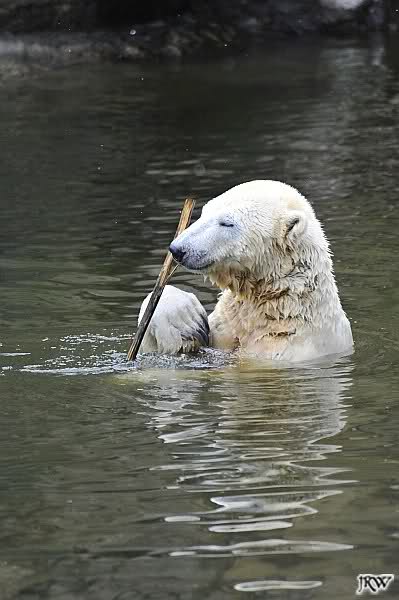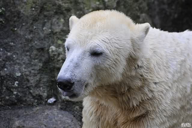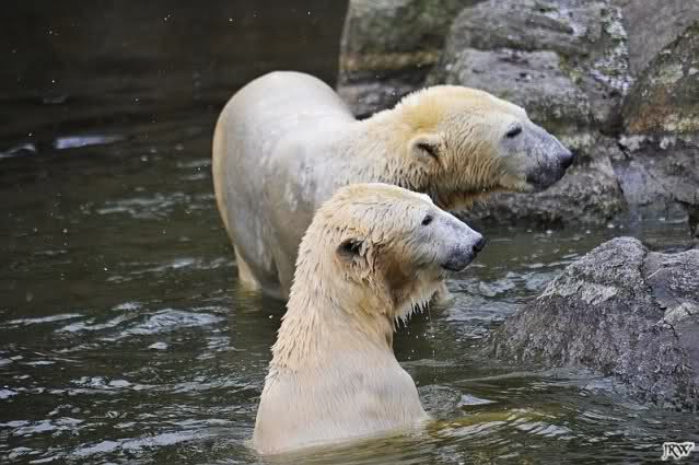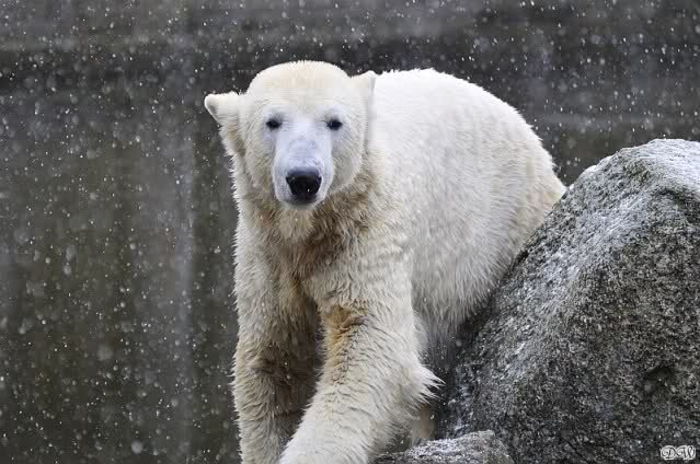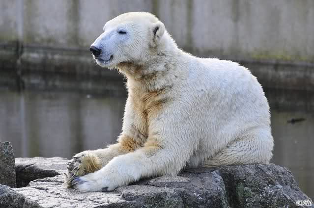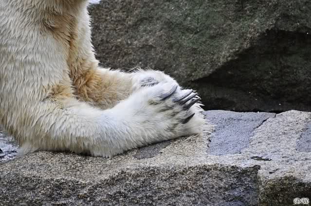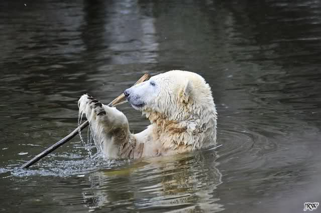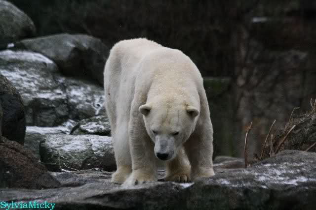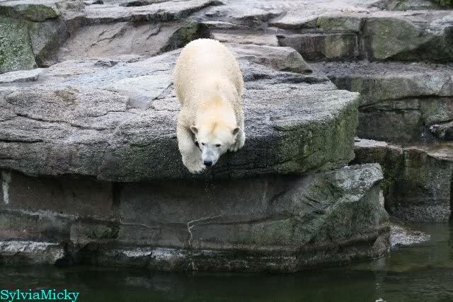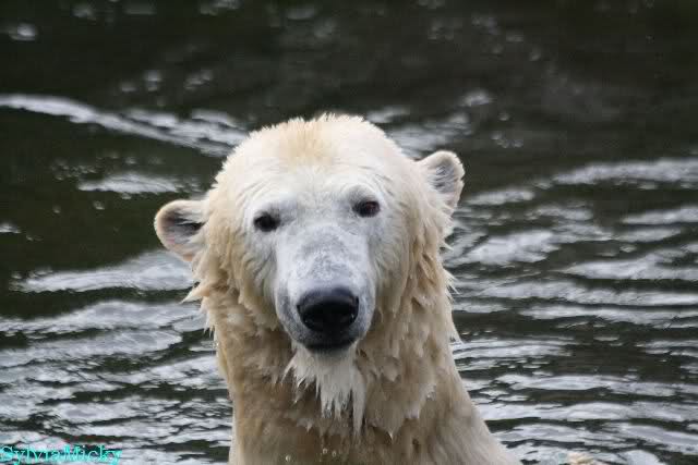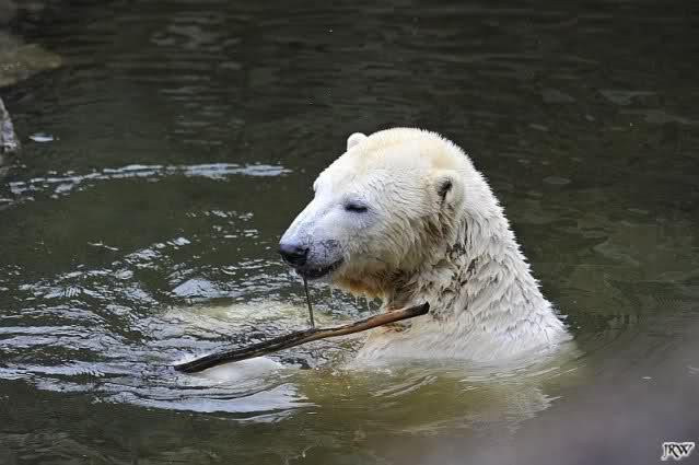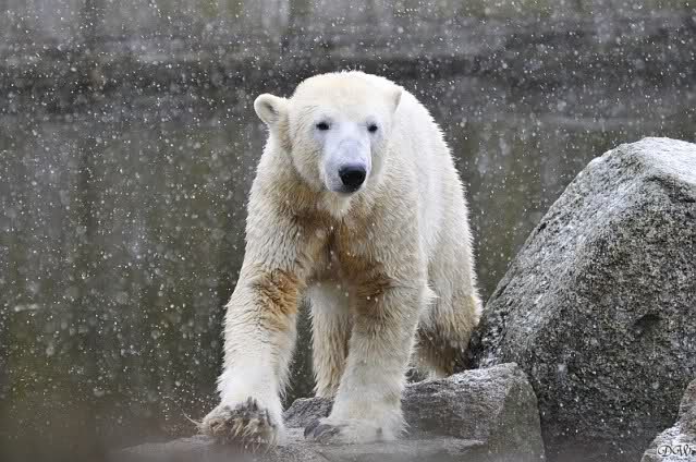 Endlich wieder eine Weile bei Knut. Natürlich hatte er aufgehört zu spielen bis ich endlich zum Gehege kam. Jessie hat noch einige Minuten erlebt. Auf jeden Fall war es gut die Viererbande wiederzusehen. Zerrupft Knut jetzt auch mit den Stanzlöchern im Fell aussieht, ist er noch immer der schönste Eisbär der Welt und wird es auch immer bleiben.
