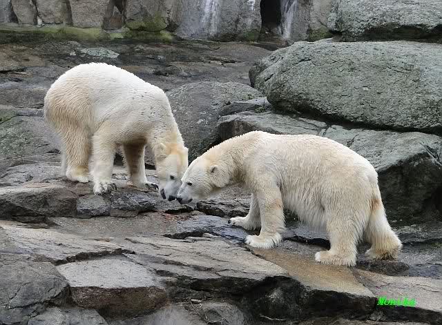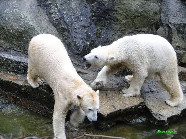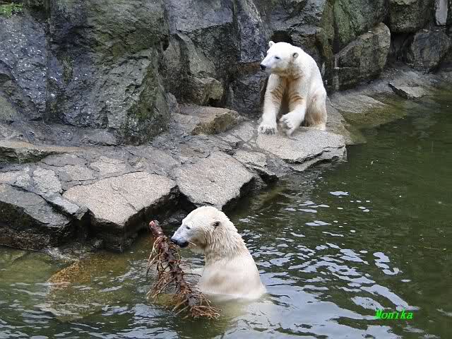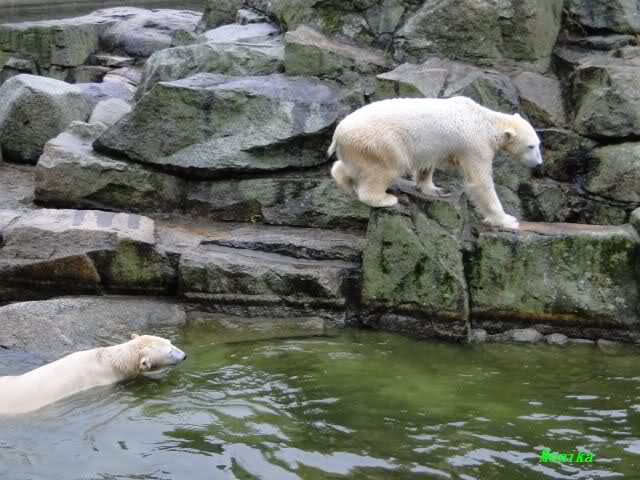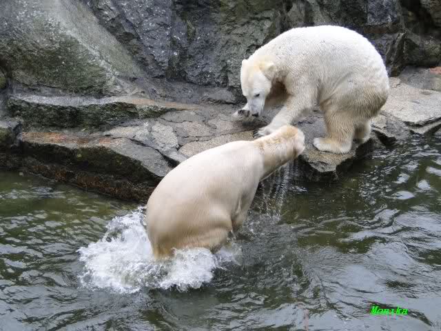 Nach der Fütterung versuchte Tosca alles um Knut ins Wasser zu bekommen. Ihr Ideenreichtum war kaum zu überbieten. Aber Knut ignorierte alles und schnaufte auch sie an.