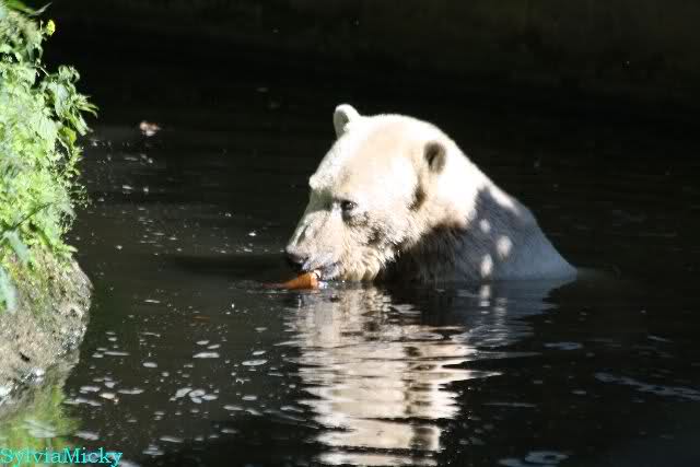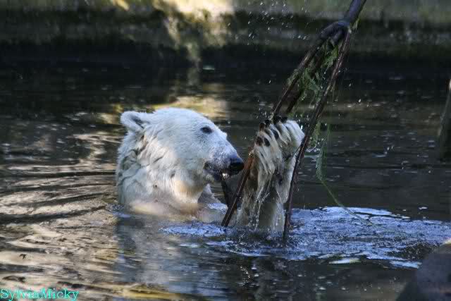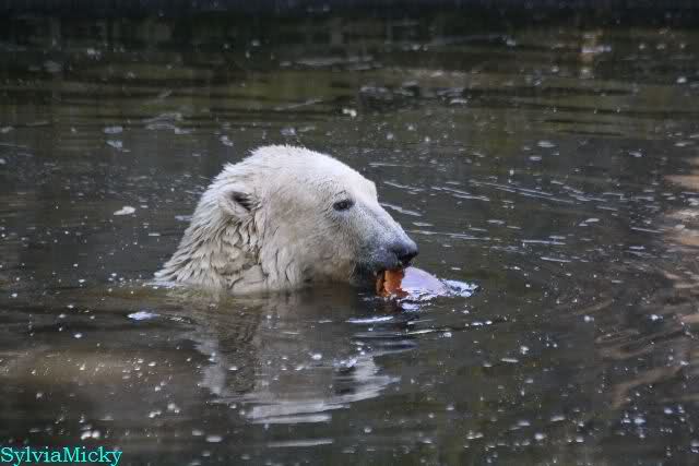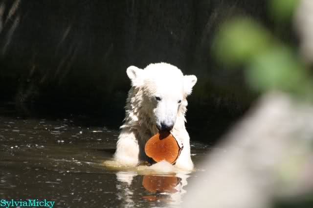 Ich bleibe dabei: Knut braucht ein richtiges vernüftiges großes Eisbärengehege mit frischem Wasser und Rückzugsmöglichkeiten, er braucht größeres Spielzeug, an dem er seine Kräfte messen kann und er sollte auch durch Varianten der Futtergebung spielerisch beschäftigt werden. So wie es in Stuttgart, München, Bremerhaven, Hannover, Nürnberg, Rostock (bald auch in Hamburg) und auch bei den "unseren" Bären in Orsa und Antibes geschieht.