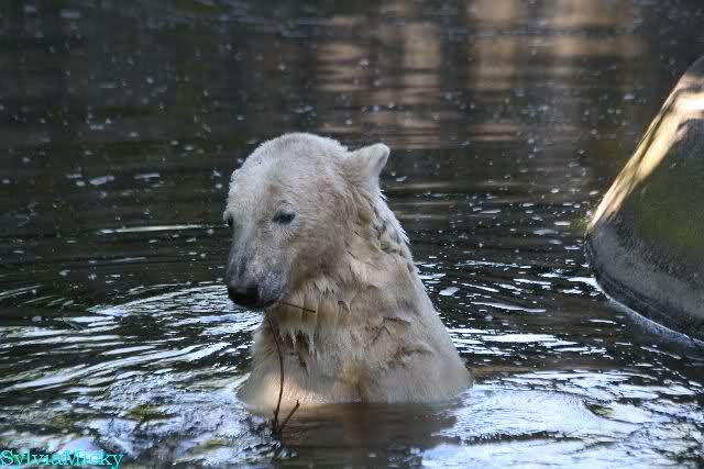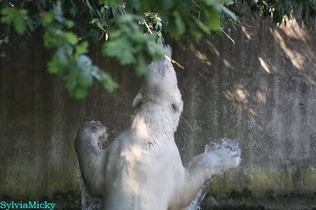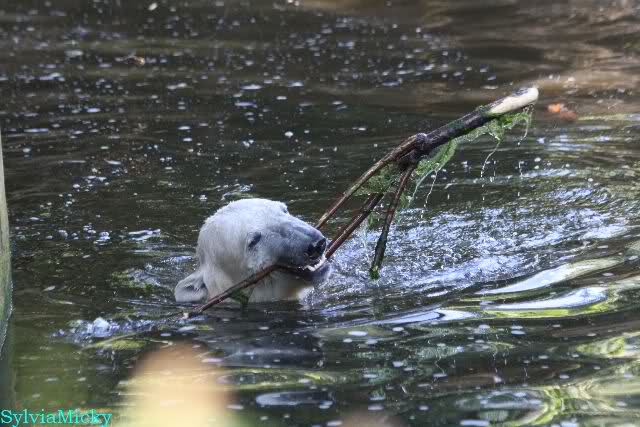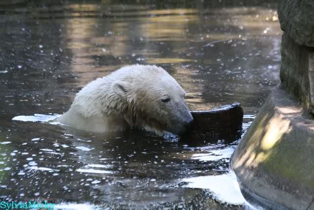 Ich war heute von 9.00 bis 12.00 im Zoo. Knut tobte die meiste Zeit im Wasser. Er spielte mit einem großen und kleinen Stock, dem Huhn, den Kugeln, den Holzscheiben und dem Baumstamm.