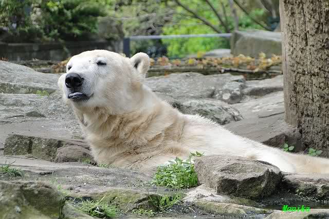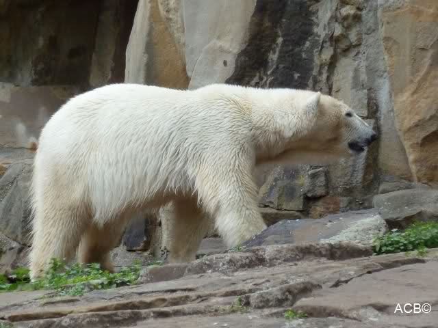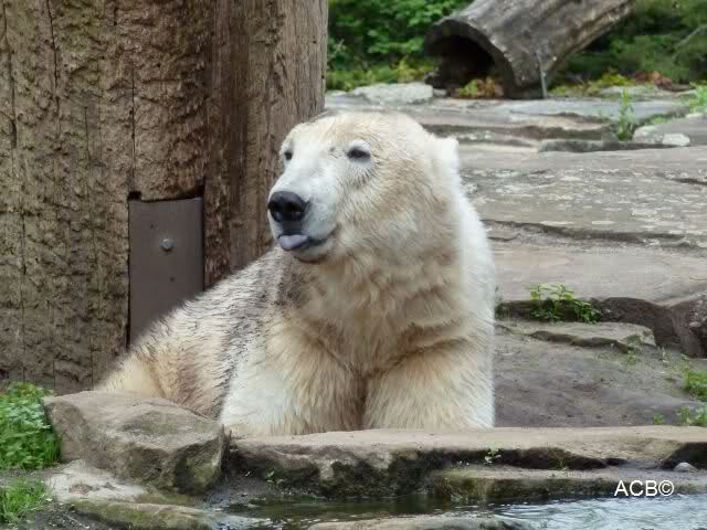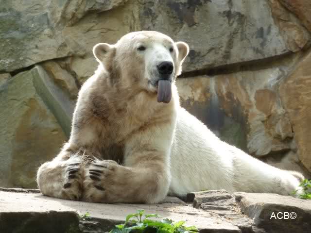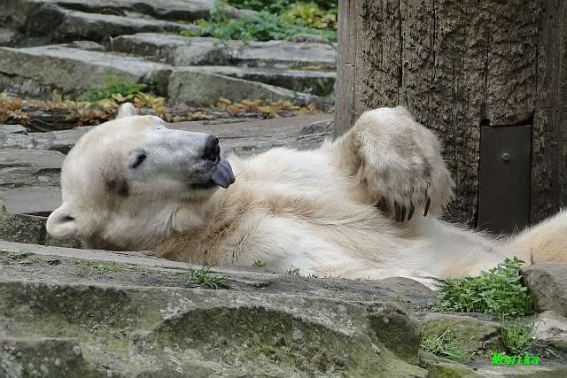 Dann gingen wir zu Knut und Gianna. Während Gianna es sich weiter hinten auf der Anlage gemütlich gemacht hatte, lief Knut vorn immer hin und her. Als er uns sah, steckte er mehrmals die Zunge heraus. Was sollen wir denn davon halten? Zweifellos meinte er uns, denn es war niemand anders mehr am Gehege.