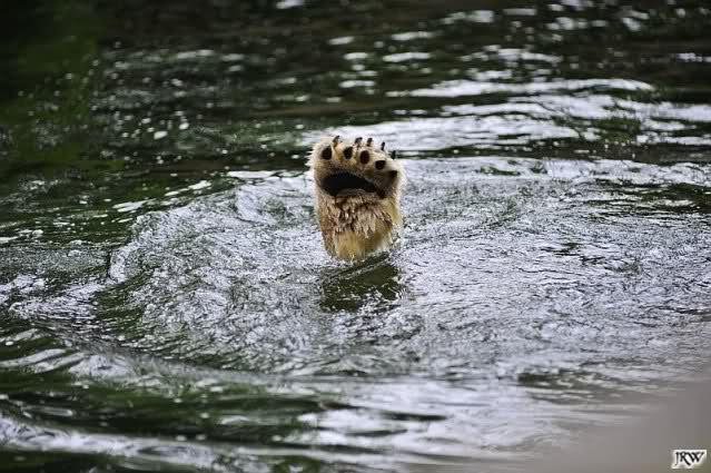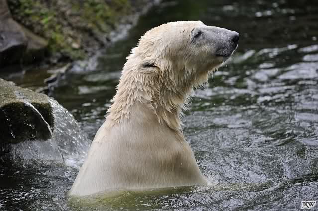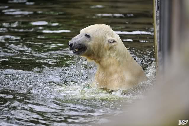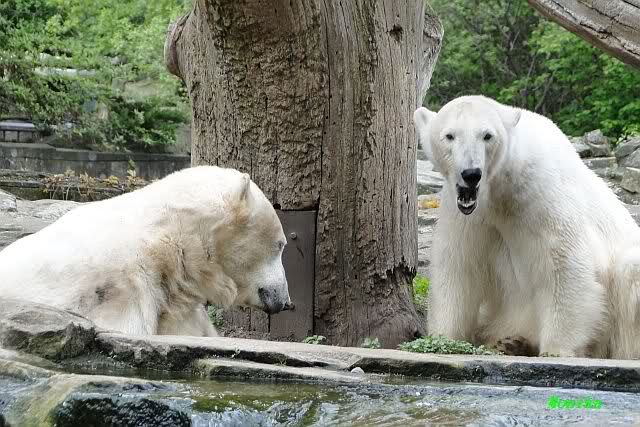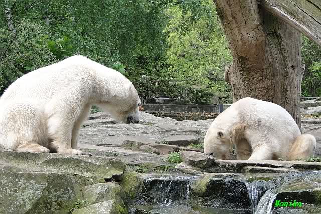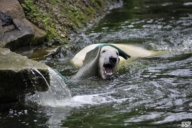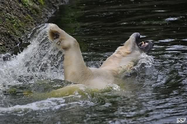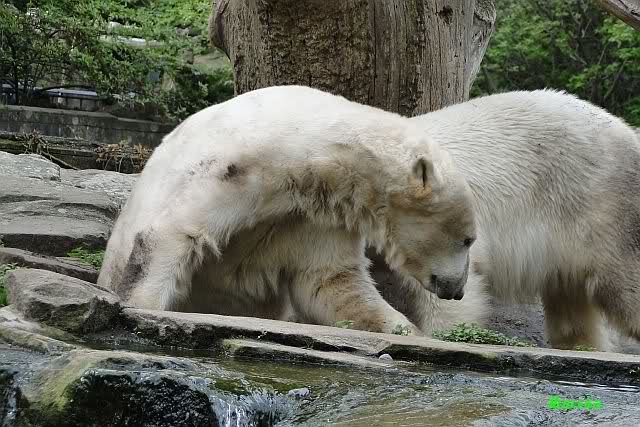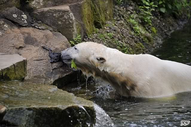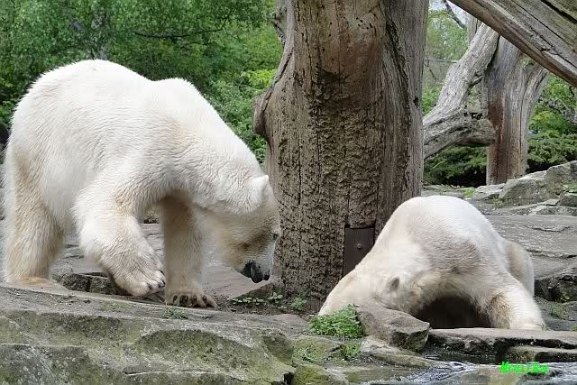 Auch nachmittags wollte Knut nicht schrecklich viel mit Gianna zu tun haben. Dafür spielt er vergnügt allein im Wasser. Sein Blick ging aber trotzdem ab und zu nach oben zu ihr. Als sie dann hinunter kam, brüllte er sie nach kurzer Zeit mächtig an. Vielleicht weil sie seinen Fisch aus dem Wasser geholt hatte? Knut hatte eine Lachsforelle bekommen und Gianna leckte den „Tisch“ ab. Einen Apfel fand sie und dann sah sie einen Fisch, den sie schnell holte und dann erst oben verspeiste. Sie waren beide wieder hinreißend schön.