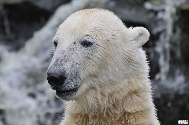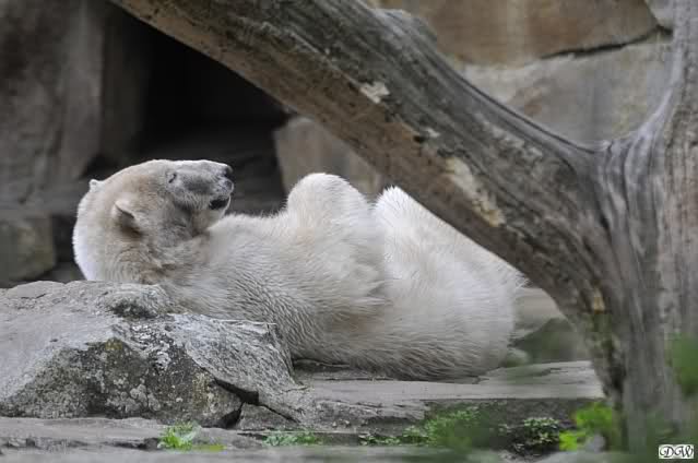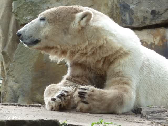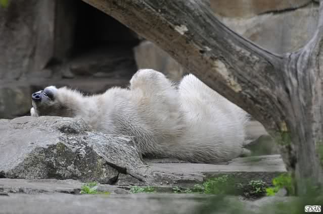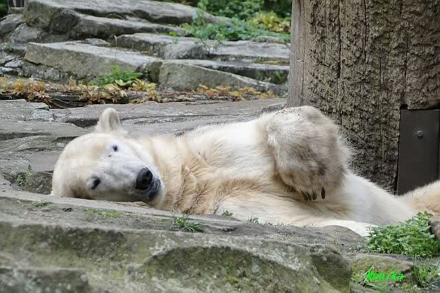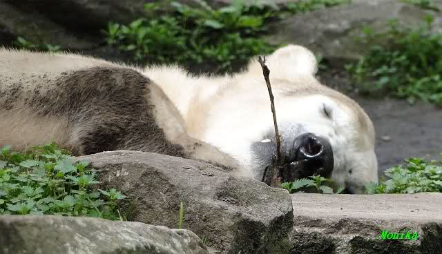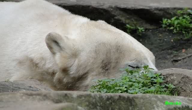 Heute morgen bei Knut und Gianna wie üblich: Knut schläft und Gianna läuft. Als Gianna langsam auf Knut zu ging, wurde sie von ihm angebrummt und verzog sich wieder.