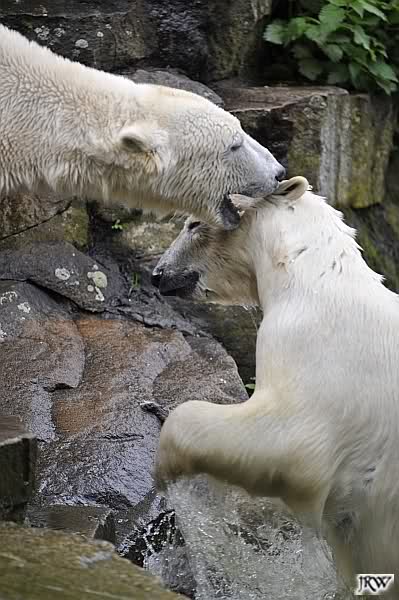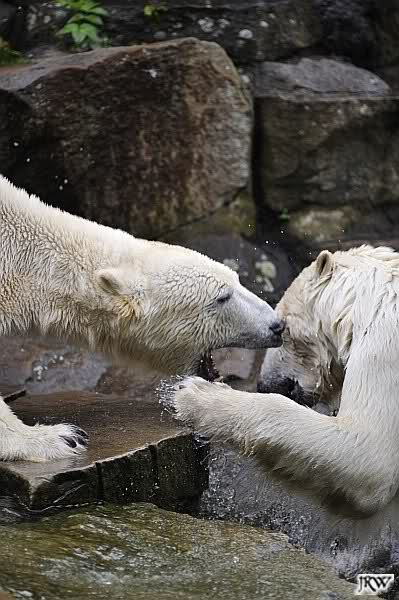 Dann ging ich zurück zu Knut und Gianna. Die beiden waren nun erwacht und wanderten umeinander herum. Mit Spielen und Schmusen war heute nicht viel. Aber Gianna hatte ihr Make-Up vervollkommnet und trug noch zusätzlich schwarze Streifen auf dem Rücken. Sehr schick.