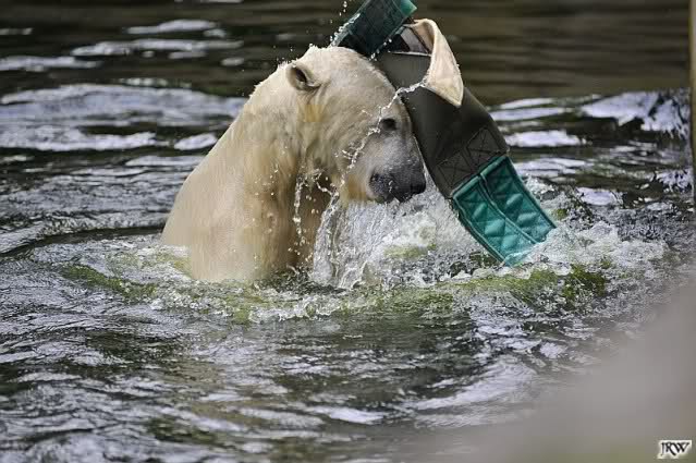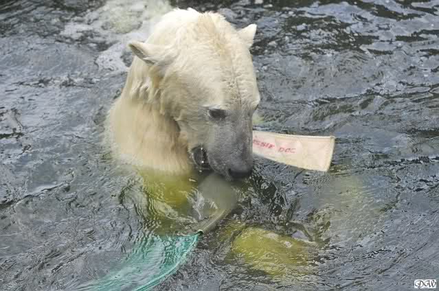 Die Fütterung von Knut machte heute Frau Weckert, sie hatte auch schon die Eisbärenfütterung am Vormittag gemacht. So wie immer in letzter Zeit ließ Knut keinen Krümel für Gianna übrig. Auch ´ne Art, dass Liebe durch den Magen geht…