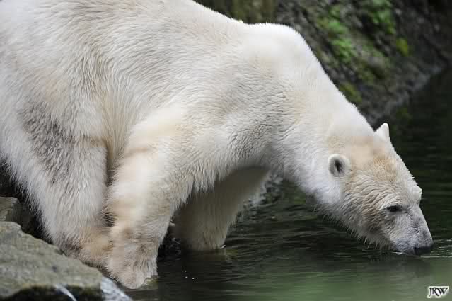 Weil es inzwischen kurz vor halb elf war, ging ich zu den großen Eisbärinnen. Heute beanspruchte Katjuscha die große Insel für sich. Tosca besetzte die kleinere. Nancy blieb am Ufer stehen. So hatte jede ihren Platz und es gab es bei der Fleischverteilung auch keinen Zoff. Die drei Damen haben ausgezeichnete Ess-Manieren. Sie fischen das Fleisch aus dem Wasser und legen es auf den Rücken ihrer Tatzen, wo es dann manierlich verspeist wird.