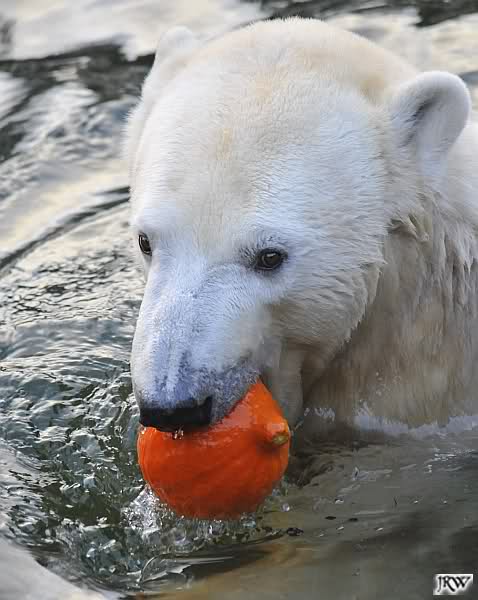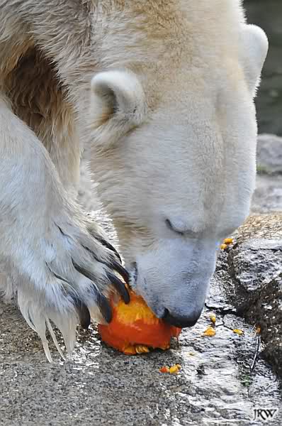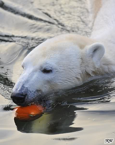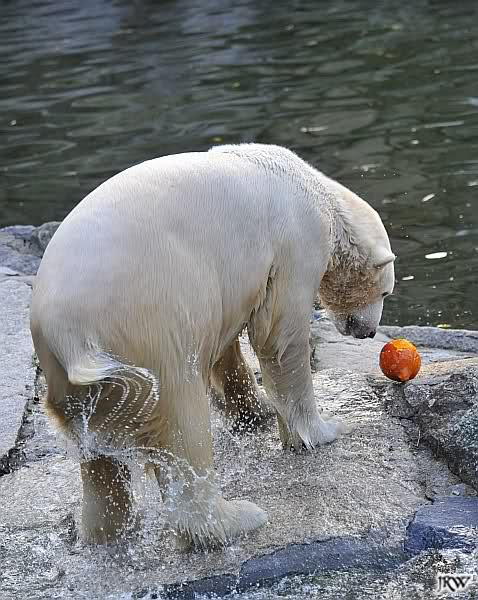 Heute Nachmittag fühlte Knut sich pudelwohl. Herr Röbke warf einen Kürbis ins Wasser, den ihm Besucher gegeben hatten. MR erzählte, dass man Knut jetzt morgens und abends etwas Zeit allein auf der Anlage geben würde, damit er sich wohlfühlen kann. Wie schön für Knut! Erst ruderte Knut ewig lange um den Kürbis an Land zu bekommen. Aber er war zu weit weg. Nachdem er lange Zeit versuchte und versuchte, entschied er sich doch ins Wasser zu gehen. Wie so oft, einmal im Wasser und er kommt dann lange Zeit nicht mehr heraus. Der Kürbis wurde schnell verspeist und dann tobte Knut von einer Ecke des Grabens zur anderen. Je länger er spielte, desto mehr Besucher kamen um ihm zuzusehen und sie waren eine Weile ständig in Bewegung, da er wirklich den gesamten Graben zum Spielen nutzte und die Leute immer hinterher laufen mussten um ihn nicht aus den Augen zu verlieren.