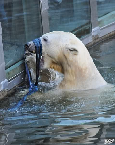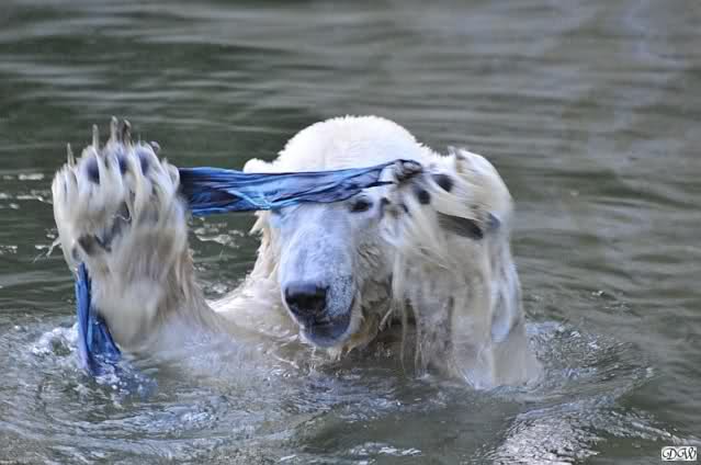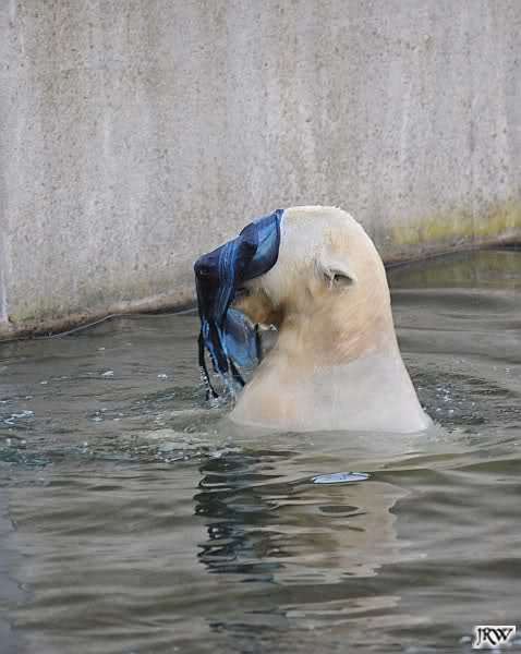 Knut spielte mit seinem Ball, dann fand er ein blaues Tuch mit dem er wirklich seine Freude hatte. Er zeigte es einem kleinen Kind an der Scheibe und dann auch allen anderen, die dort standen. Allerdings kann er damit schummeln, er kann durchsehen auch wenn er es über den Augen hat. Dann fand er sein T-Shirt und wickelte es sich um den Kopf. Das Fotografieren wurde schwierig, die Lichtverhältnisse wurden immer schlechter. Auf einmal holte er seinen geschundenen Ball und fing an ihn in Richtung Zuschauer zu werfen. Wir hatten neulich gerätselt ob er wohl die Schmollecke benutzen würde wenn er je wieder auf die Idee käme, den Ball zu werfen. Genau das hat er heute getan. Bis über die Mauer hat er es noch nicht geschafft, aber viel fehlte nicht. Sicher lag es auch an dem Ball, der nicht mehr soo rund ist. Als es schon praktisch total dunkel war, hörte er wohl den Pfleger und flitzte aus dem Wasser um Einlass zu finden. Wir waren bis zu dieser Zeit zu Eiszapfen mutiert.