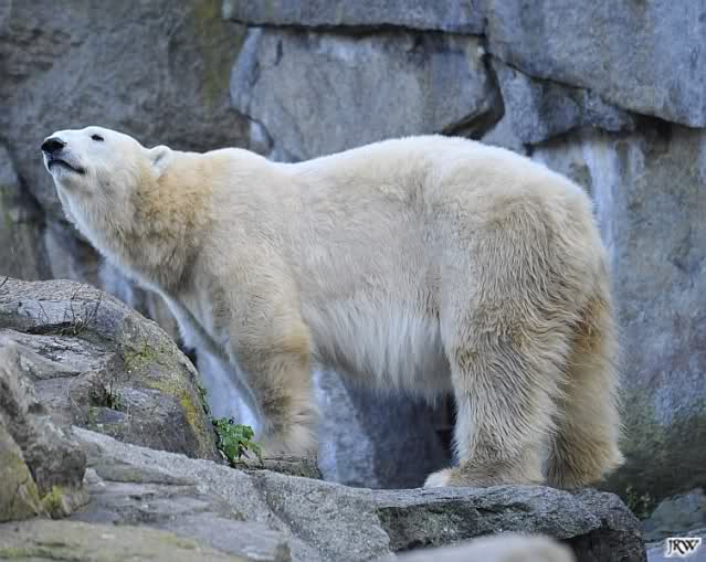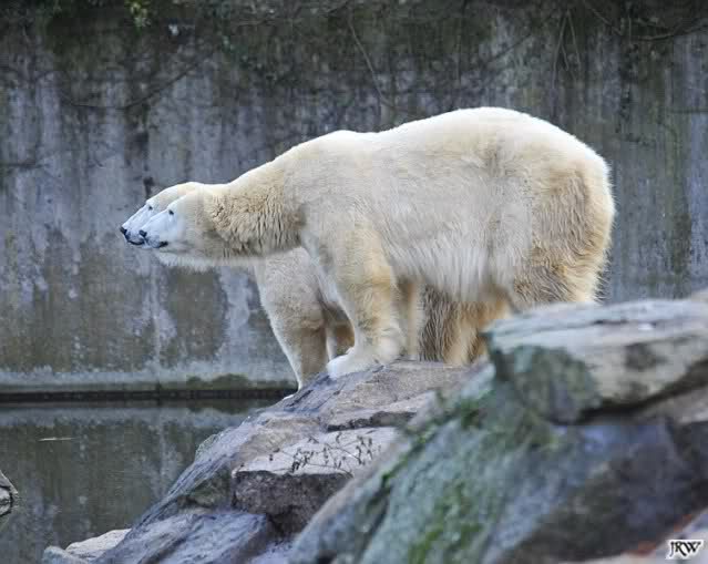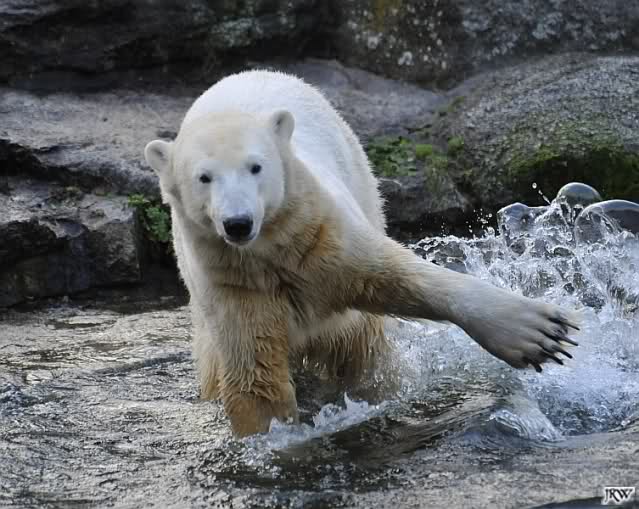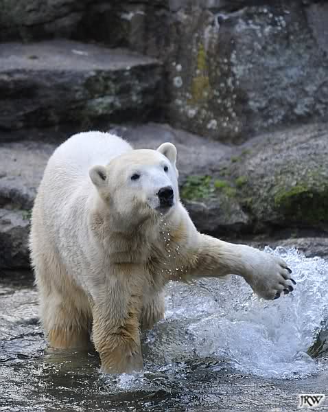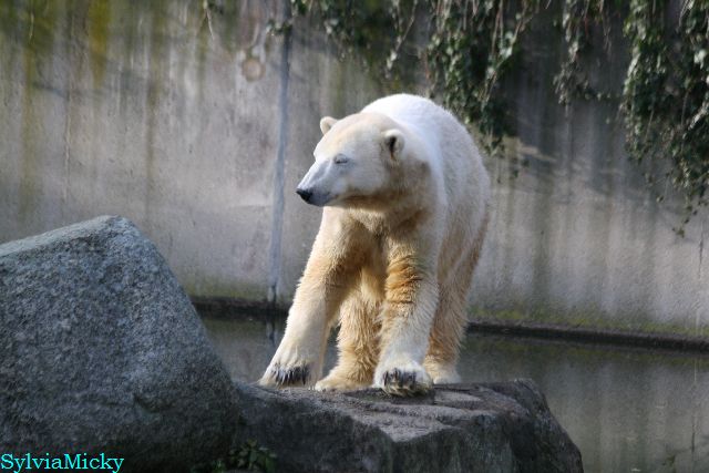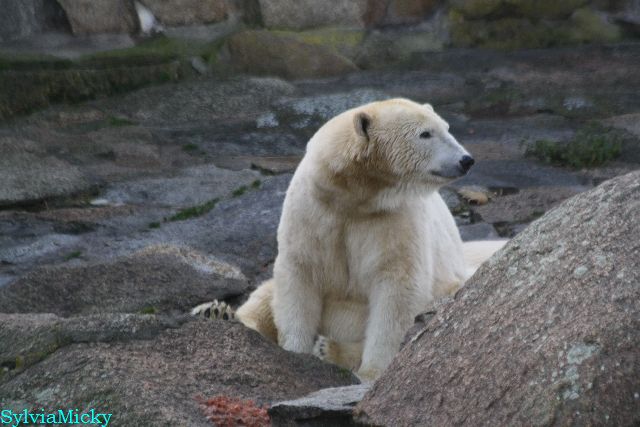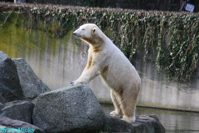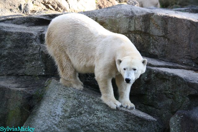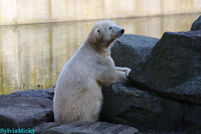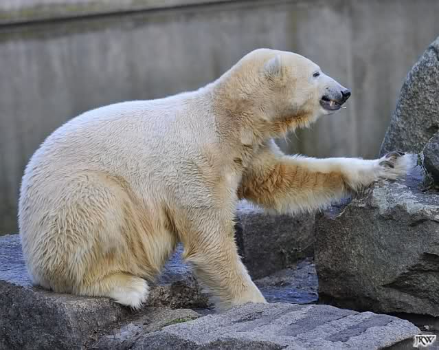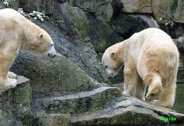 Knut ging danach auf die Anlage und stieg auf einen der hohen Felsen. Da kam Kati an. Sie stellte sich mit den Vorderpfoten an den Felsen und hob ihre Vorderpfote und brüllte laut. Knut brüllte mächtig zurück. Sie machte kehrt, ging dann doch wieder hin. Diesmal gab Knut nach.