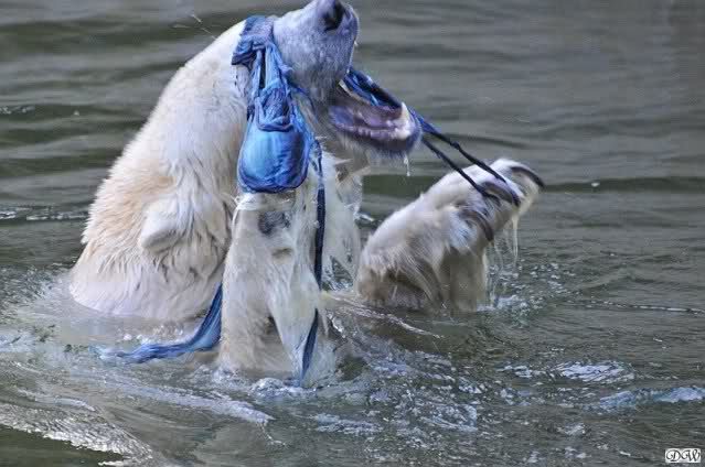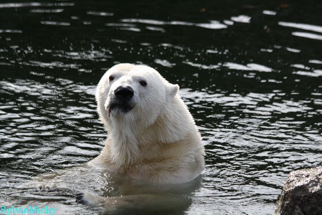 Inzwischen kamen auch Nancy und Tosca an. Angelockt von dem lautem Gebrülle. Mir kommt es manchmal so vor, als wenn Tosca Knut schützen will. Wie bei der Situation mit Nancy früh. Tosca schwamm, schaute Nancy an und so ging Nancy von Knut weg und lief Tosca, die immer noch im Wasser schwamm, auf der Anlage hinter her.