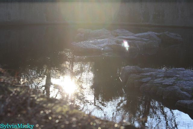 Nach der Fütterung stand Nancy unten rechts neben Knuts Futterplatz. Er brummte. Als sie sich ihm näherte, brummte er lauter. Dann hielten sie Ihre Köpfe aneinander. Sie ging dann einige Schritte zurück und setzte sich ihn. Knut versuchte dann an der rechten Seite hoch zu kommen. Das ging nicht. Dann kam Tosca noch um die Ecke geschwommen. Sie schwamm auf Knut zu aber nicht zu dicht. Sie schwamm wieder zurück und Nancy folgte ihr.
