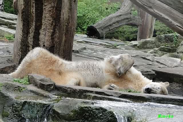 Knut hat den ganzen Vormittag geschlafen. Gianna ist erst viel gelaufen und hat sich dann auch hingelegt. Kurz vor 12.00 Uhr kam Herr Klös mit einer größeren Gruppe. H. Klös rief Knut, der sofort reagierte und aufstand. Gianna schlief weiter. Als die Gruppe nach einer ganzen Weile fortging, spielte Knut ein wenig im Wasser.