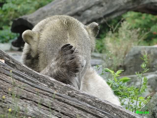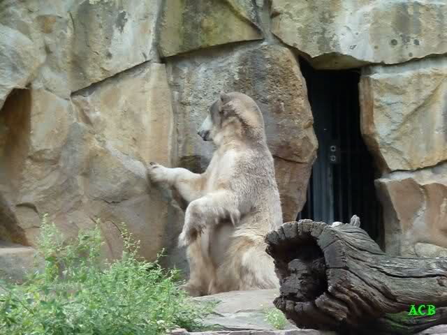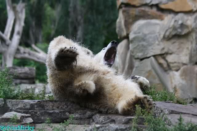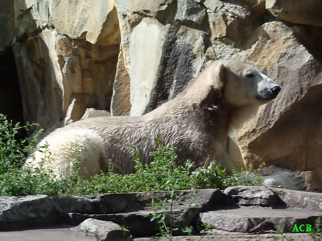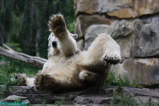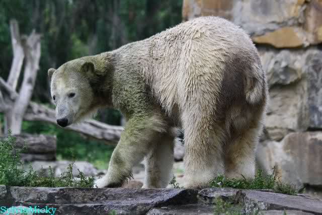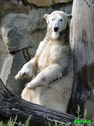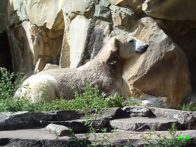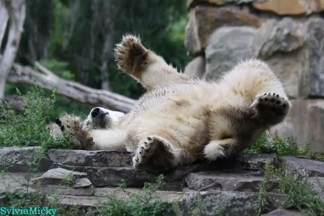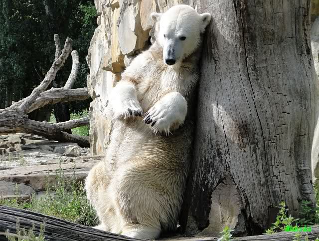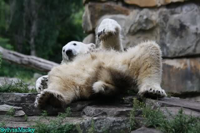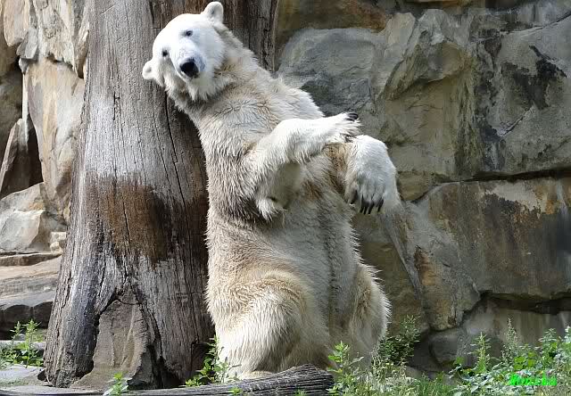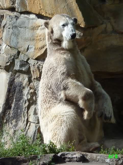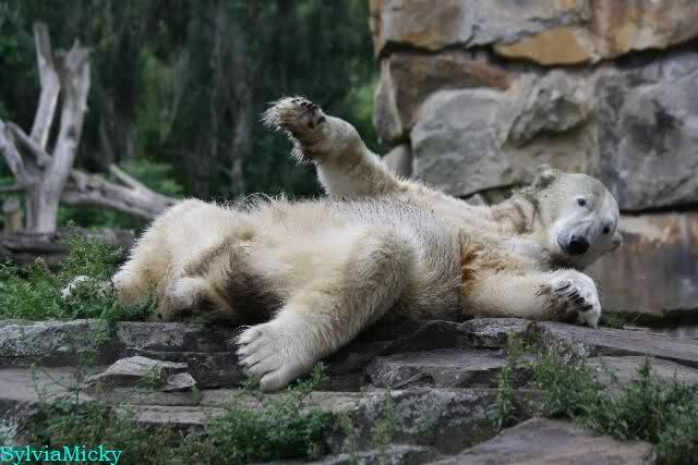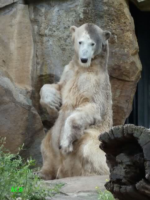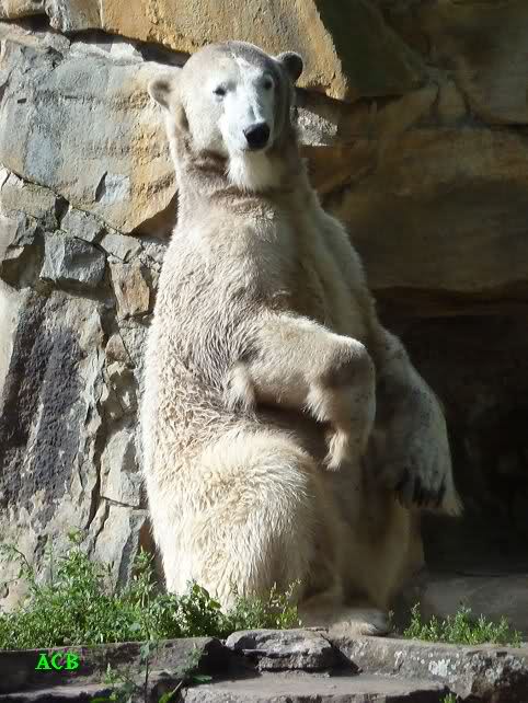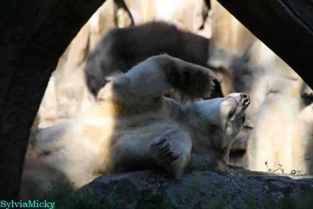 Heute Nachmittag kam ich (Anne)bei strahlendem Sonnenschein in den Zoo,wohin?,natürlich zu Knut, denn das brauchte ich nach dem schweren Dienst (auch "Rentner" gehen arbeiten)Immer wieder erfreut es mein Herz, wenn sooo viele Menschen bei Knuti stehen, und sich an ihm erfreuen. Da lag er in seiner Sand Kuhle und sonnte sich ganz genüsslich. Er sah so klein und Schutz befohlen aus, ja, er ist halt doch noch ein Halbstarker. Gegen die drei Mädels ist er ja noch sehr klein, und ich mag gar nicht daran denken, dass er es mit diesem eingespielten Trio aufnehmen muss!!! Schön, das von Nah und Fern so viele liebe Knut-Fans angereist sind, herzlich willkommen in Berlin bei unserem Star "Knut"!!! Nicht war, es lohnt sich immer wieder, egal wie weit man fahren muss, denn Knut ist doch jede Strapaze wert, oder??? Liebe Gisela-Sylvia-Monika "DANKE" für die wunderschönen Bilder!!! Am besten haben mir die gefallen, wo er so richtig "rum-fleetzt", einfach das Bären Leben genießen, so lange es noch geht in "seinem Paradies"!!!
