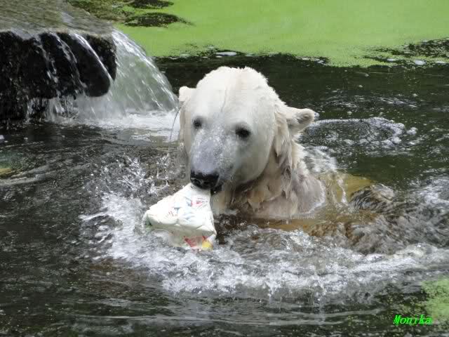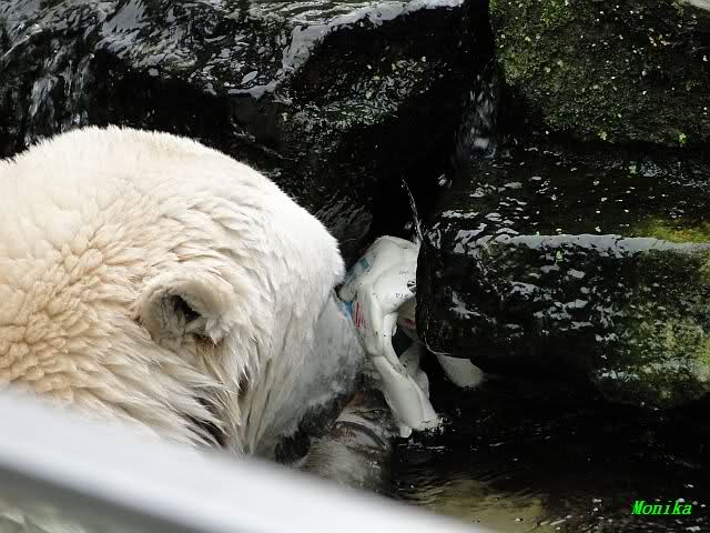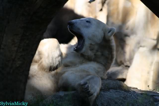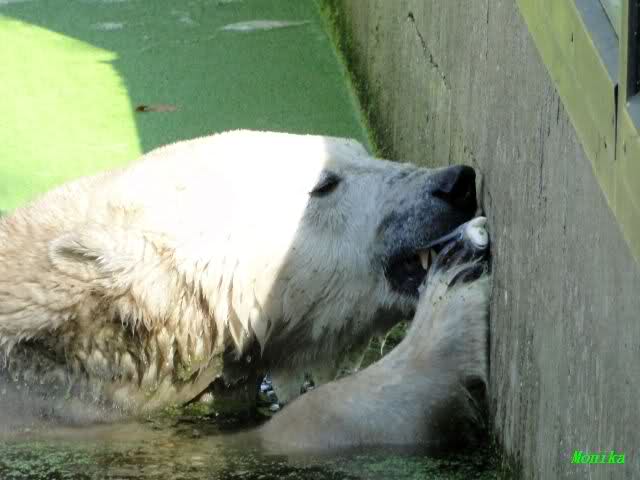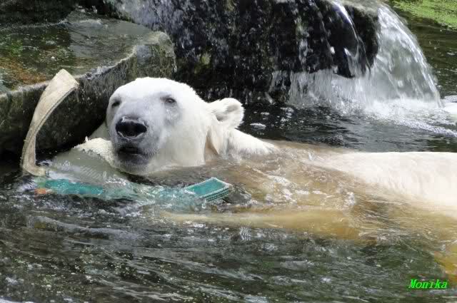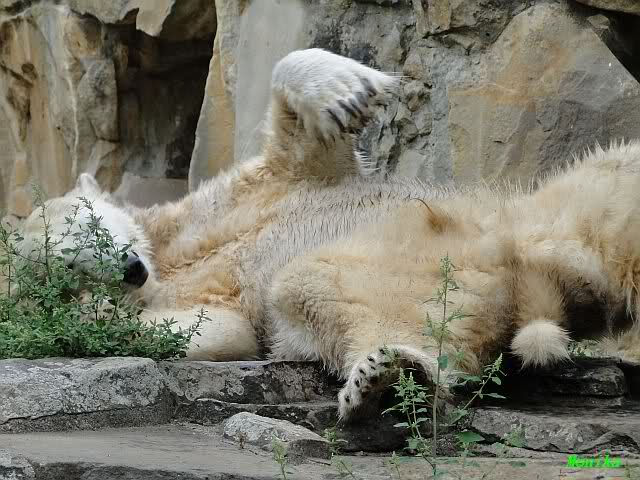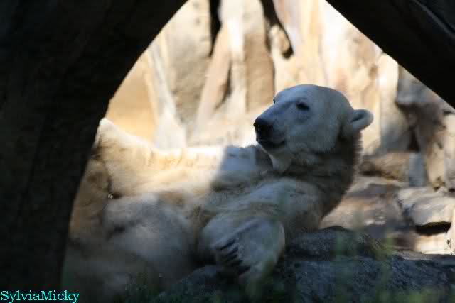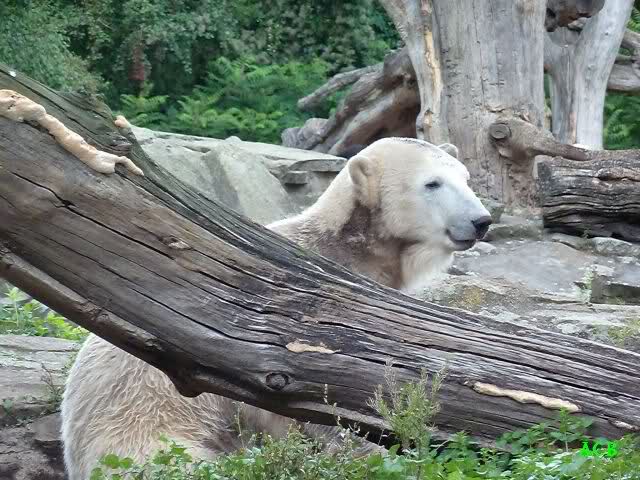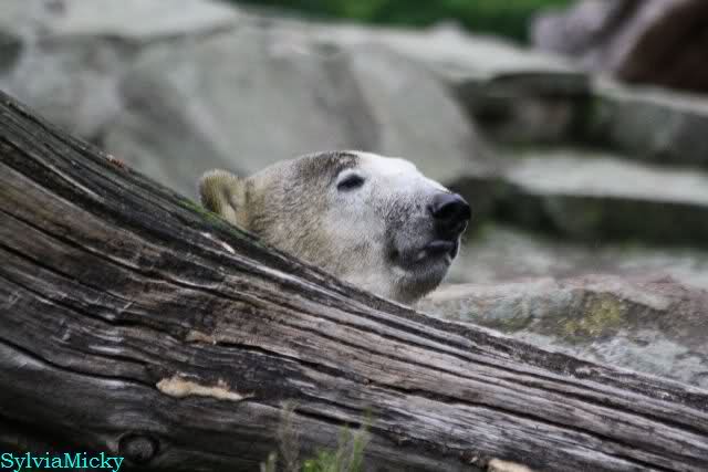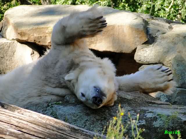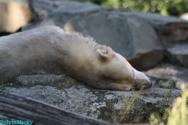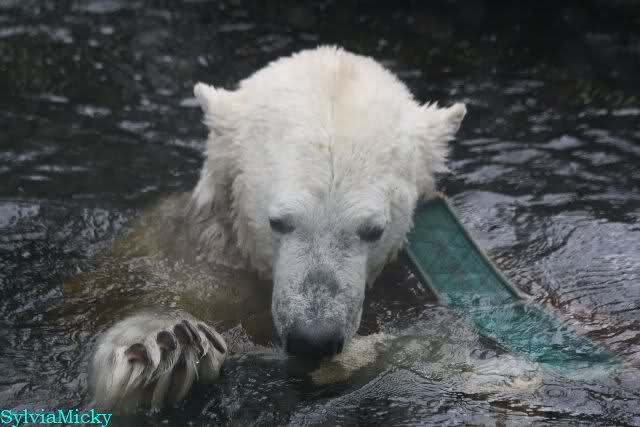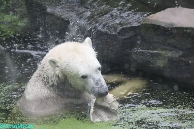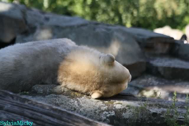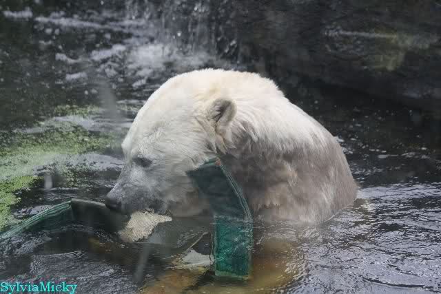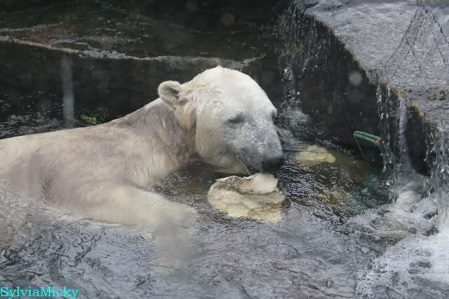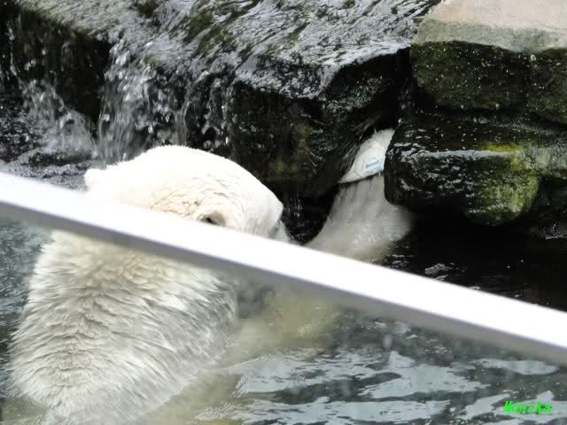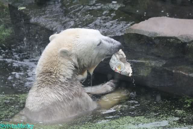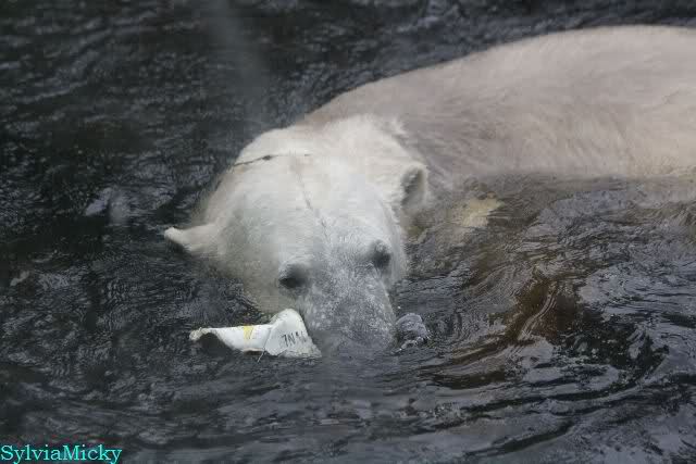 Wie Sylvia schon schrieb, schlief Knut heute Morgen. Er suchte sich immer wieder eine andere Position, und sah wieder so süß aus. Wie ein Engel. Nachdem er sich ausgiebig rekelte, ging er ins Wasser. Er fand unter anderem noch einen großen Fisch von gestern. Sehr zur Freude aller Besucher, spielte er auch heute mit seinen Gästen Ball.