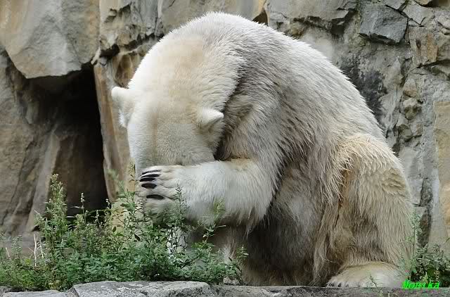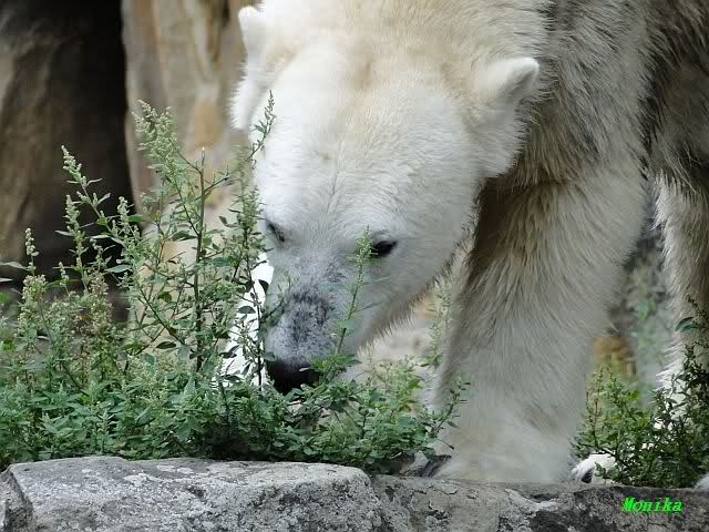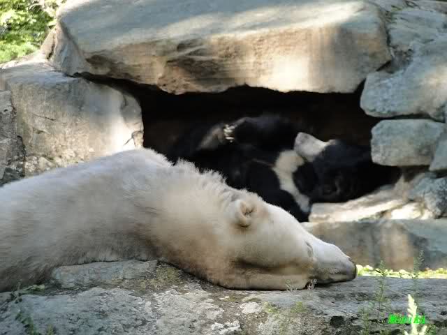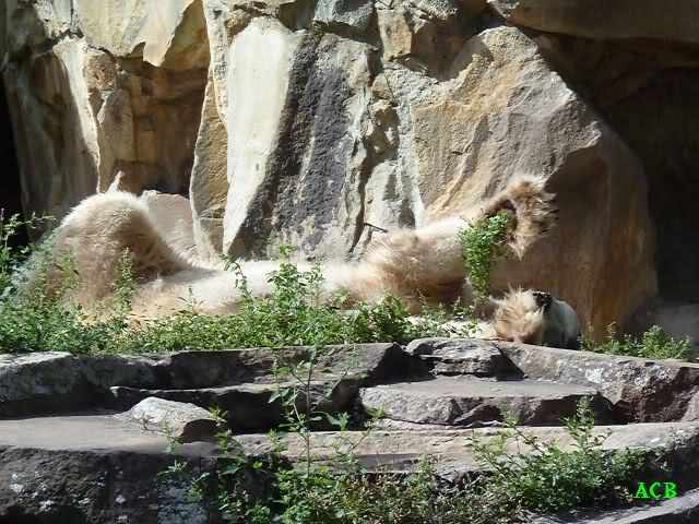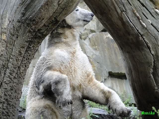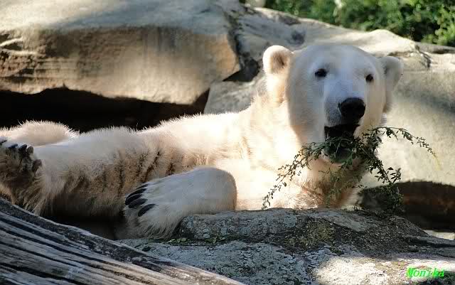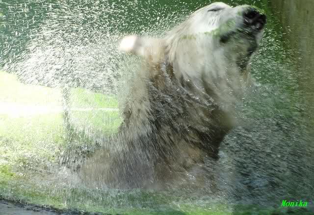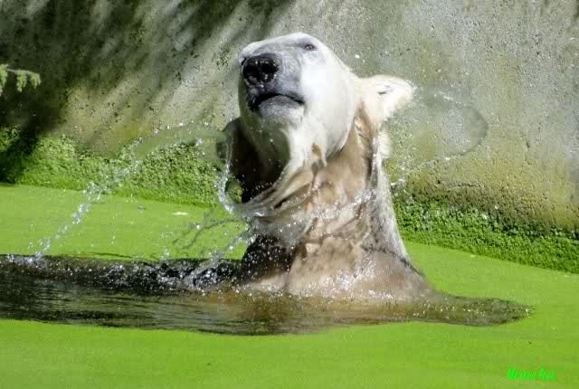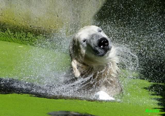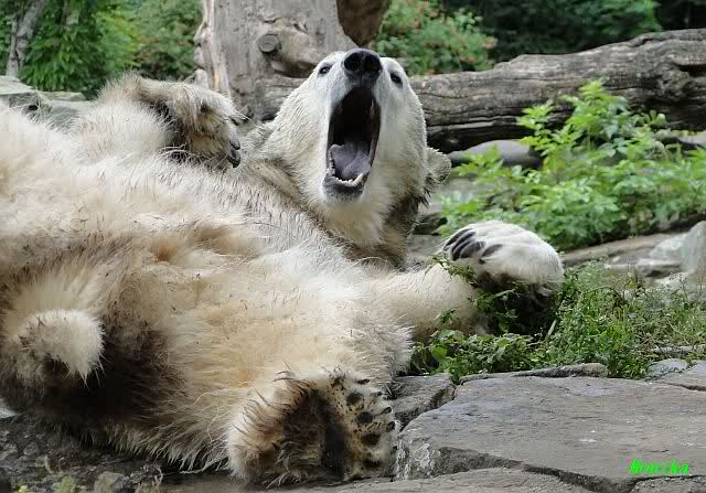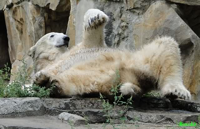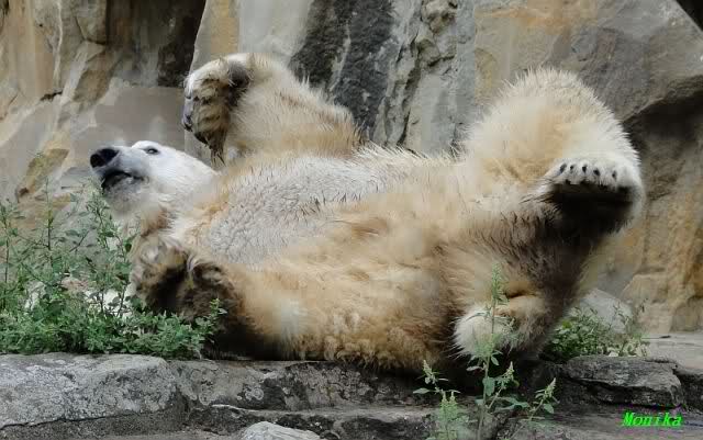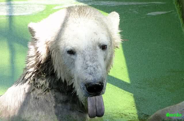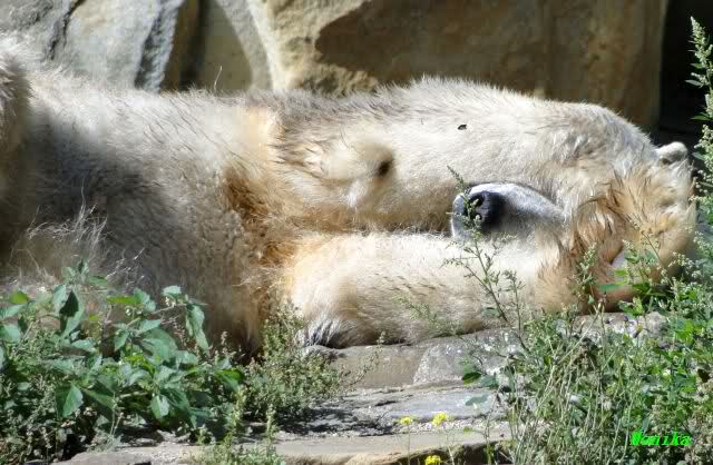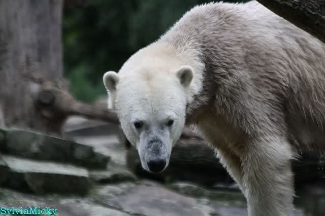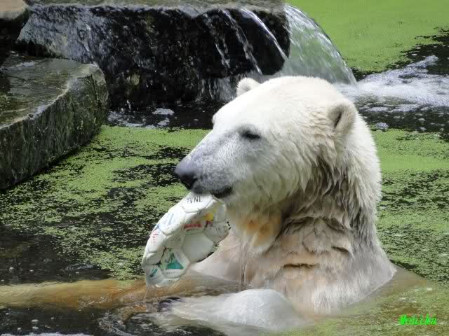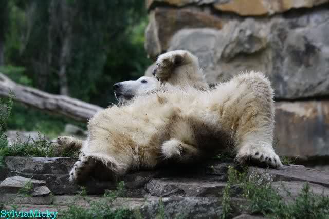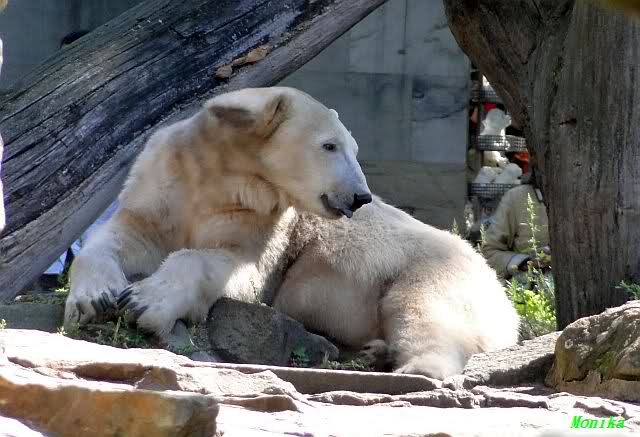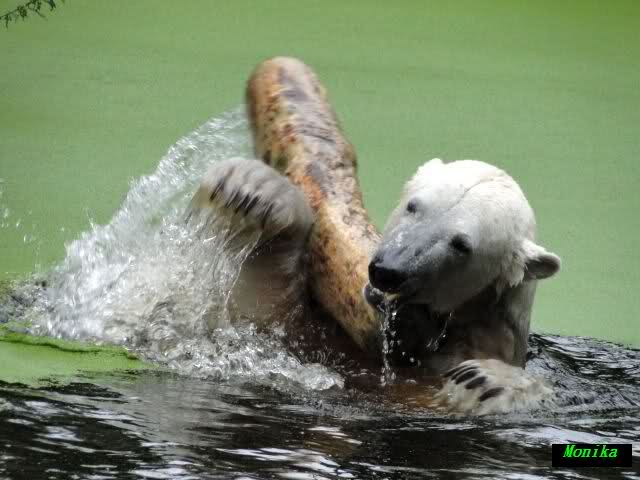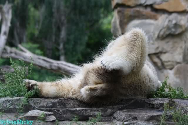 Wie Sylvia schon schrieb, schlief Knut heute Morgen. Er suchte sich immer wieder eine andere Position, und sah wieder so süß aus. Wie ein Engel. Nachdem er sich ausgiebig rekelte, ging er ins Wasser. Er fand unter anderem noch einen großen Fisch von gestern. Sehr zur Freude aller Besucher, spielte er auch heute mit seinen Gästen Ball.
