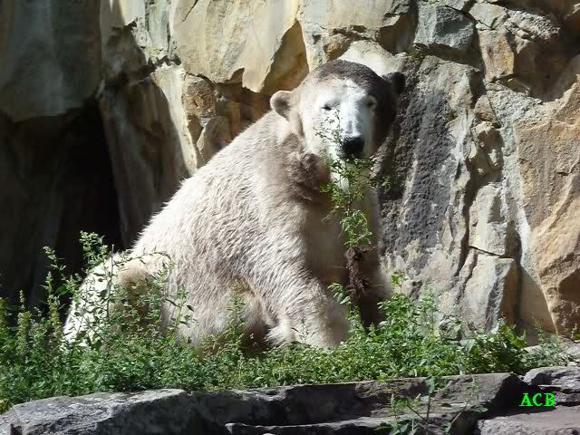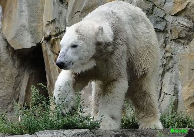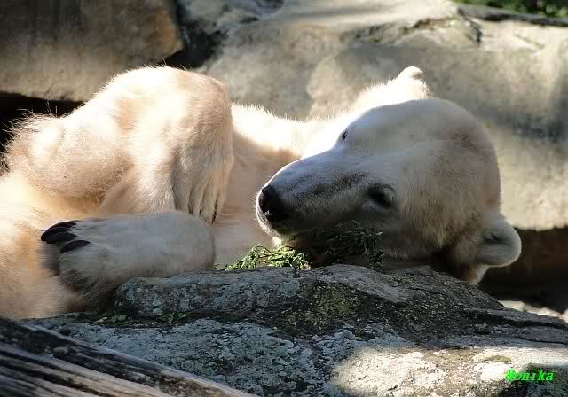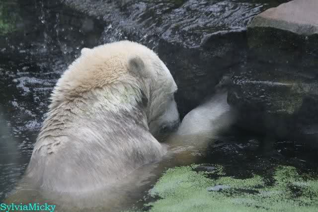 Heute Vormittag lag Knut auf dem Stein und schlief. Dann reckte und streckte er sich und war erstaunt über die vielen Besuchern an seinem Gehege. Gegen Mittag war kein Platz mehr direkt am Gehege zu bekommen. Knut ging dann in den Wassergraben und fand noch Reste von gestern.