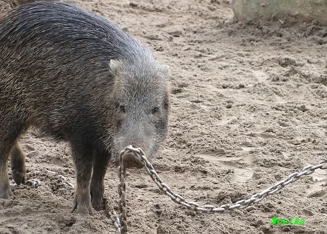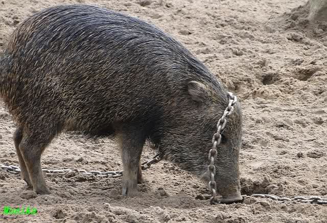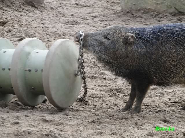 Bei den Pekaris gab es heute die "Futter-Rolle". Wenn die Schweine die Rolle bewegen, kommen aus den Löchern Leckerlis heraus.