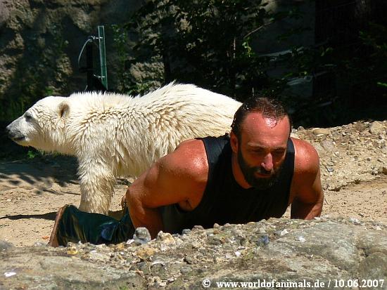 Kein Tag ohne Fotos von Knut. Darum heute wieder ein weiterer Rückblick *Remember the Knut-Show*. Fotos vom 10. Juni 2007, es war ein sehr heißer Tag. Und Knut schwamm mit TD im Wassergraben, der für uns normale Besucher leider nicht einsehbar war.