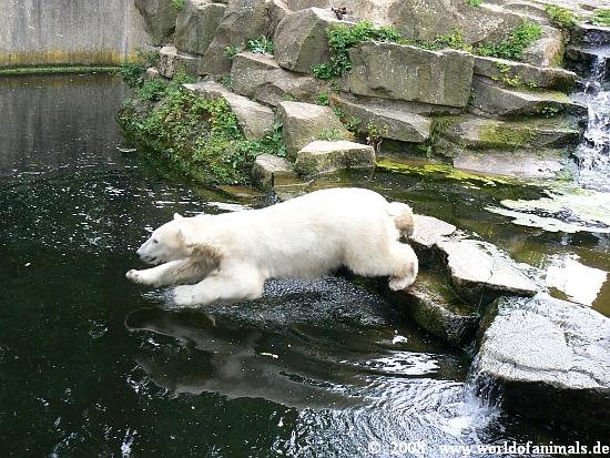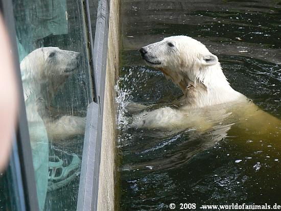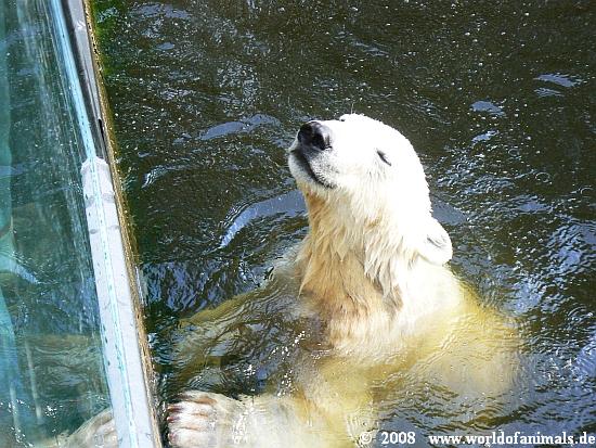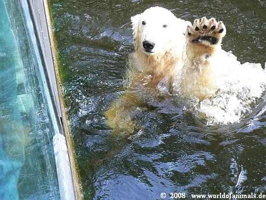 Zum Abschluss des Tages wollte ich noch mal nach Knut sehen. Der war schon wieder im Wasser. Als ich an die Scheibe trat, kam Knut auch angeschwommen. Dann sprang er vor mir mehrmals halb aus dem Wasser, so als wollte er sich von mir verabschieden.