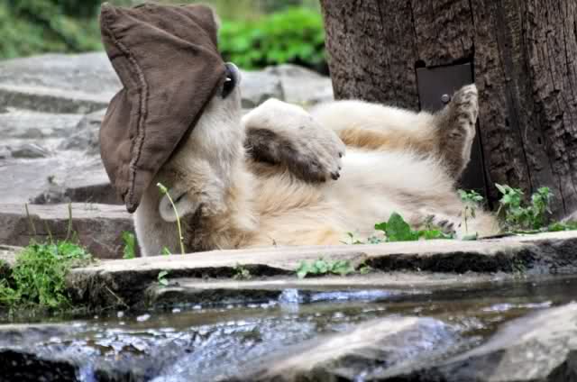 Knut bewies, dass er etwas von Mode versteht. Er schlang sich den Jutesack als Stola um den Hals. Dann wickelte er ihn um seinen Kopf, sozusagen als Turban oder als Kopftuch. Zwischendurch probierte Knut immer wieder, ob der neue Look badetauglich ist. Er drehte und kugelte sich. Er machte Pirouetten und streckte beide Hintertatzen in die Höhe, als ob er Handstand mache. Schließlich spielte er mit uns Verstecken und zog sich den Sack übers Gesicht. Eine Dame äußerte die Angst, dass Knut aus dem Sack nicht mehr herausfindet. Er fand heraus und das sehr geschickt.