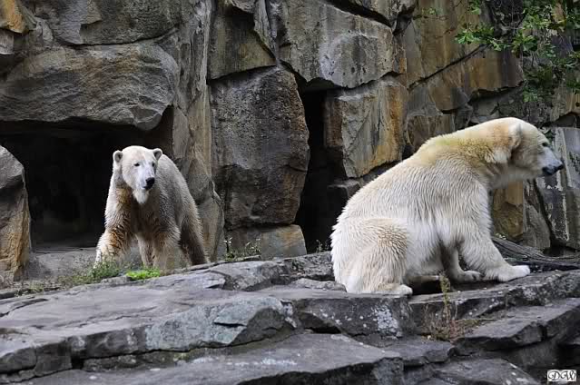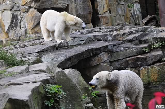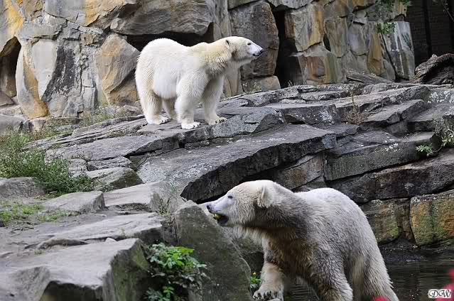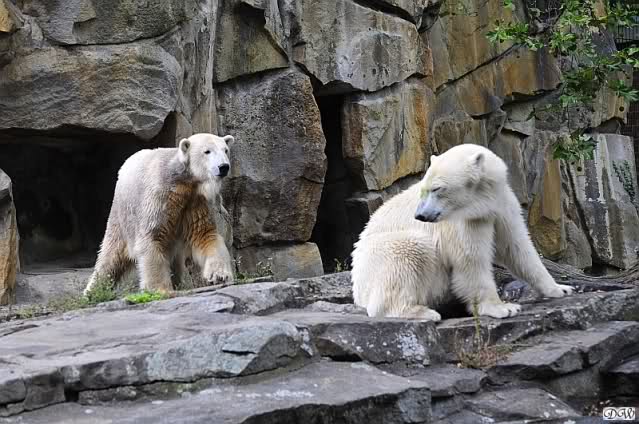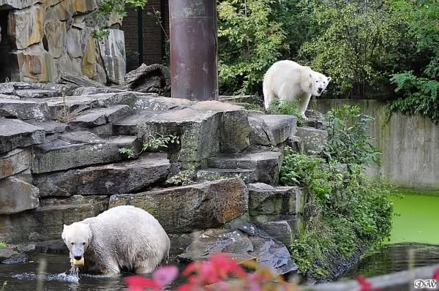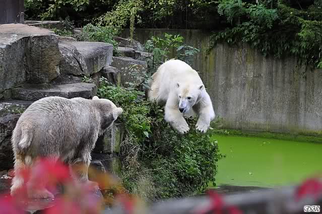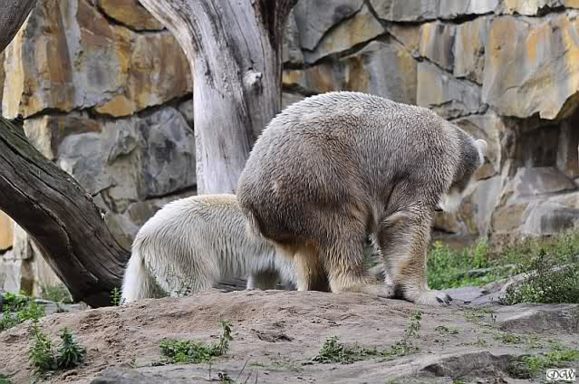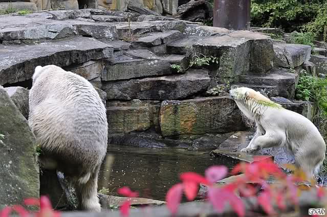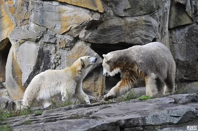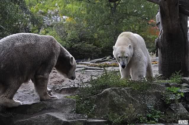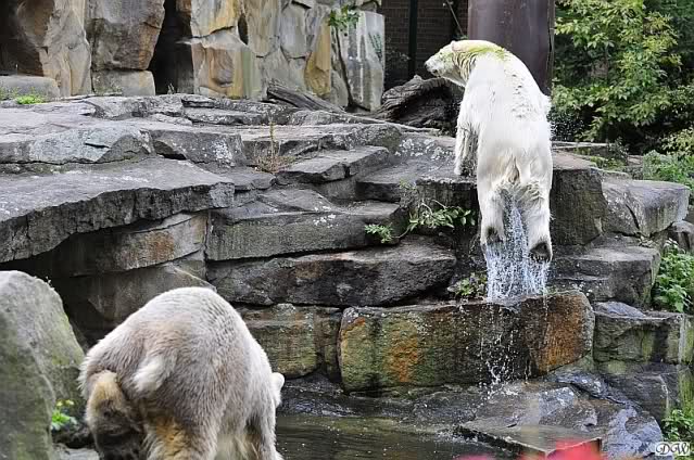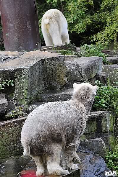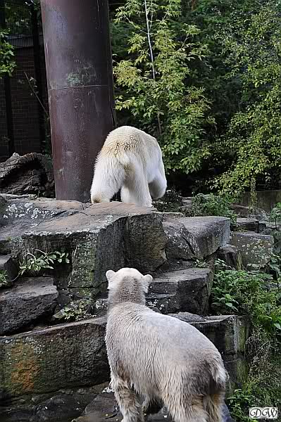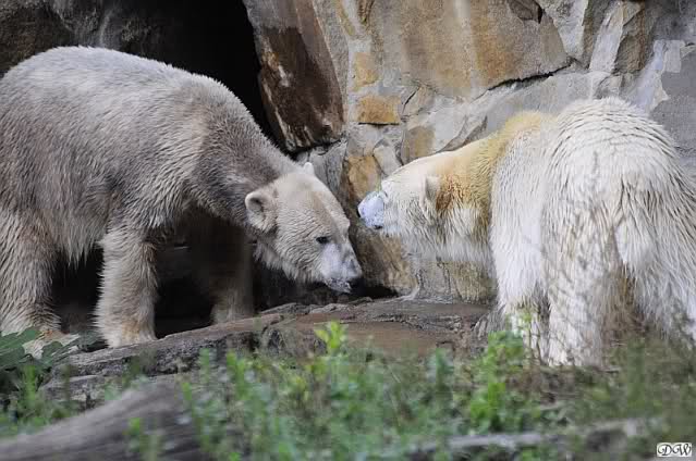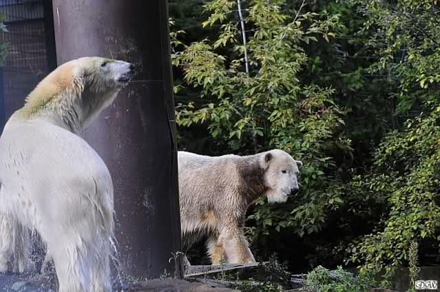 Schöne Bilder wieder von den beiden! Es ist schön, dass sich die beiden vertragen. Bald werden sie (vor allem Knut) ihre Scheu voreinander ganz abgelegt haben. Mal sehen ob wir dann einen weißen Knut sehen oder ob er Gianna davon überzeugt, dass es auch andersfarbige Eisbären gibt.