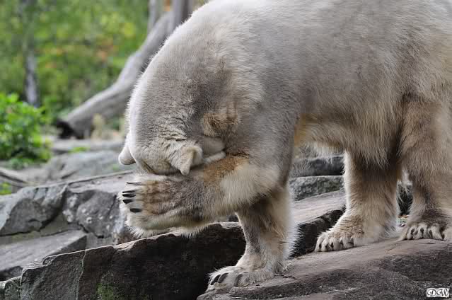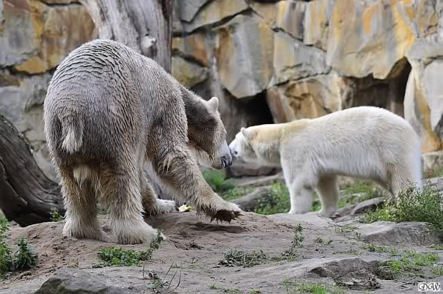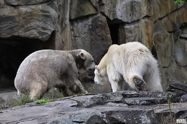 Im Grunde wurde schon alles gesagt. Einen Scheinangriff wie in dem Artikel beschrieben haben wir auch nicht gesehen. Insgesamt sind wir jeden Tag zuversichtlicher dass die beiden Bären sich anfreunden werden. Sie stehen schon öfter enger beisammen und man kann immer wieder erleben, dass sie einander suchen. Nicht ängstlich sondern interessiert. Knut ist gelassener als vorher (wenn er auch ab und zu noch den Po einzieht und das Weite sucht)und ich hoffe, dass es nicht mehr lange dauert bis sich Gianna etwas dunkler färbt. Dann haben wir zwei "Drecksbären" wie eine etwas limitierte Dame es neulich ausdrückte.