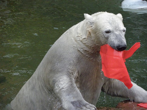 Flocke hatte gestern Morgen erstmal ganz miese Laune. Sie kam nicht gleich an die Scheibe, wie die letzten Male, sondern lief brummend und maulend auf der Insel hin und her. Als ich sie von der Plattform oben angesprochen habe, wurde ihr Gebrummel noch lauter und selbst ihr Nuckeln, das zwischendrin auch mal an der Reihe war, klang richtig sauer. Sie ist die ersten 1 1/2 Stunden fast nur gelaufen, während Raspi mal wieder seine Bahnen an der Trennscheibe zum Nachbargehege zog. Irgendwann wurde Flocke aufmerksam, weil im Pinguinstall, der ja auf der anderen Seite das Gehege begrenzt, anscheinend irgendwas los war. Sie wollte dort unbedingt durch die Tür, hat geschnüffelt und gekratzt. Raspi kam dann auch, geht ja nicht, dass was ohne ihn passiert Leider ging auch durch seine Unterstützung die Tür nicht auf. Aber zuindest war Flocke dann halbwegs munter. Beide waren auch mal oben an den Ställen und sind kurz rein, kamen aber schnell wieder raus. Ist schon witzig, wenn Rapsi sein dickes Hinterteil da reinschiebt, ich hatte fast Angst, er bleibt stecken Beide haben sich dann ganz gut beschäftigt, waren im Wasser und haben sich auch mal kurz gebalgt. Flocke hat sich mit Kanister unter der Insel hervorzerren vergnügt, wie ja auch Uli schon berichtet hat und Raspi hatte seinen Spaß mit diversen Gegenständen. Besonders schön war seine Aktion mit dem alten Sack oder was immer das mal war.