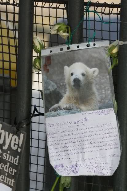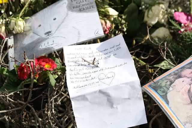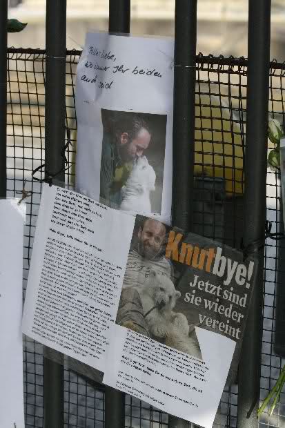 Denn die weltweite Beachtung und Anteilnahme, die sein früher Tod auslöste zeigt, dass auch der langsam ins adulte Alter heranwachsende Bär nicht vergessen worden war. Etlichen war sein Schicksal nicht gleichgültig, sie besuchten ihn regelmäßig und setzten sich für verbesserte Haltungsbedingungen ein. Dieser Traum von einer innigen Wildtier-Mensch Beziehung, von Zugewandheit, Fürsorge und Freundschaft berührte Menschen nachhaltiger und tiefer als es jedes erfundene, kommerzielle Entertainmentspektakel vermögen würde. Das finde ich beruhigend. Ebenso, dass menschliche Werte auch das Fremde und Andersartige miteinschließen können, mithin nicht auf die eigene Art beschränkt bleiben. Der Eisbär und sein Pfleger waren bekannt, hatten einen Charakter, ein Gesicht. In der Konstellation und als Sympathieträger schafften sie es spielend Gefühle zu wecken. Wenn Menschen in Japan gerettet werden, ist das eine gute Botschaft, eine ermutigende Information, doch zu den Geretteten besteht keinerlei Beziehung, sie sind unbekannt. Naturgemäß kann so eine Nachricht nicht spontan Tränen wecken. Wer traurig ist über Knuts unerwarteten Tod, muß nicht notwendigerweise ignorant sein gegenüber den Bedrohungen, Leiden und Vorgängen in der Welt, wie es gern suggeriert wird. Der emotionale Haushalt und die Wahrnehmung des Menschen funktioniert weit weniger eindimensional und monoman als Kritiker anprangern. Trotz des Entsetzens über die apokalyptischen Zustände in Japan und das Leid der Betroffenen, trotz des bedrohlichen GAUs, kriegsähnlicher Zustände,..- die Liste ist lang, gibt es auch weiterhin vergossene Tränen über verlorene Fußballspiele etwa. In der von Katastrophen, Krieg und Politik geprägten Nachrichtenlage, konnte ich auch keine Dominanz des Knut-Themas ausmachen. In den Medien über die ich mich informiere, war das Ableben des berühmten und beliebten Bären eine Randnotiz. Um näheres zu erfahren, musste ich am Sonntag wiedereinmal online suchen...