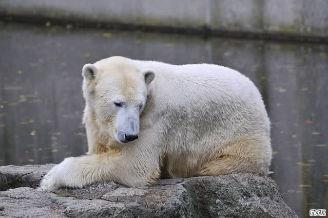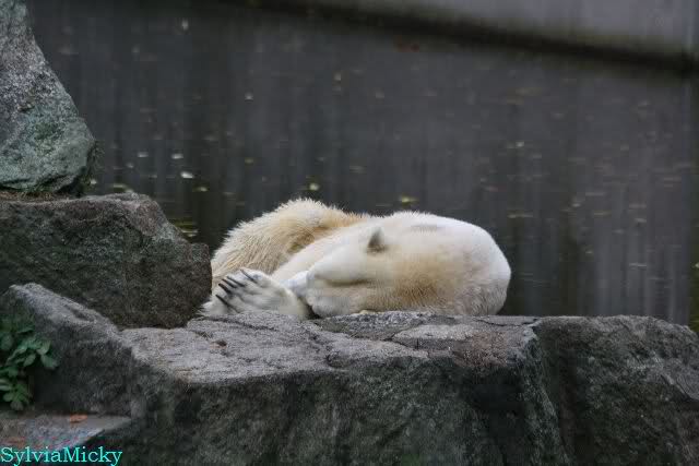 Nach der Fütterung hatte ich den Eindruck, daß Knut schon gerne auf die Anlage gegangen wäre aber sich wegen der Drei nicht traute. Also legte er sich wieder auf die vordere Ecke.