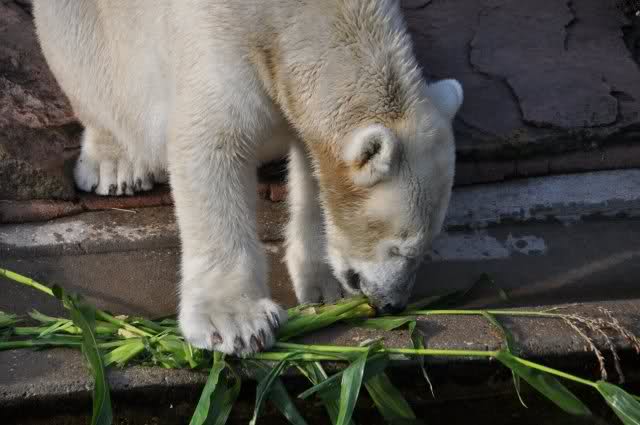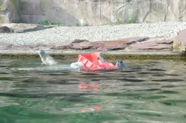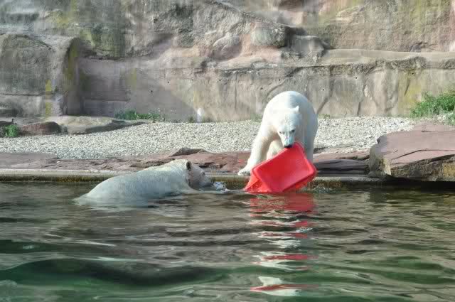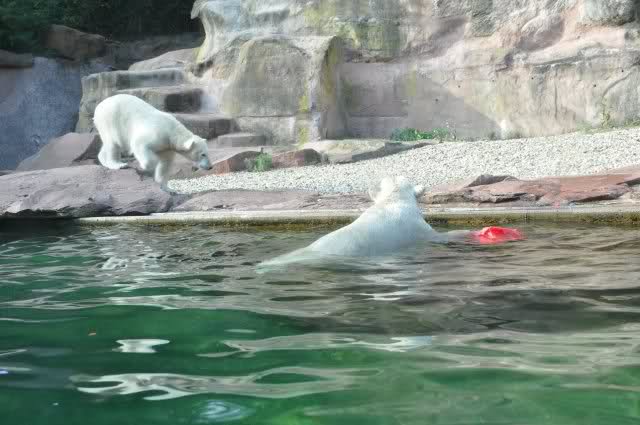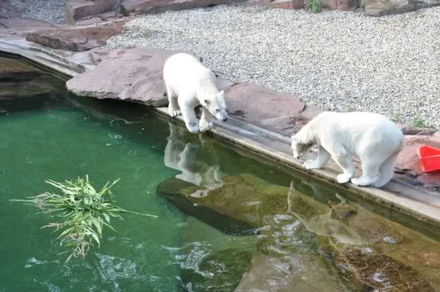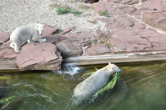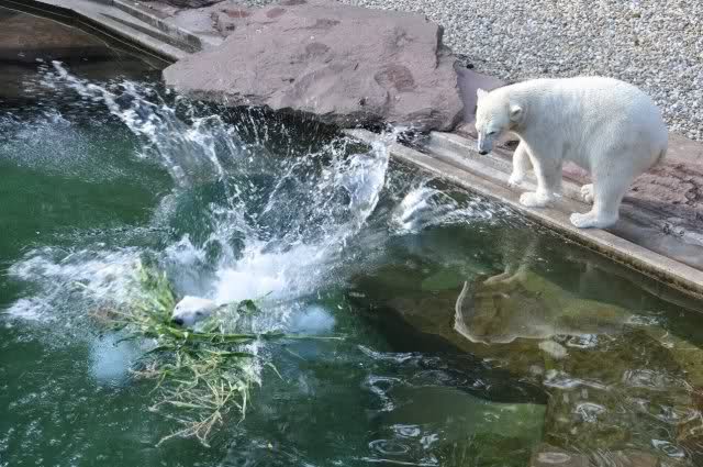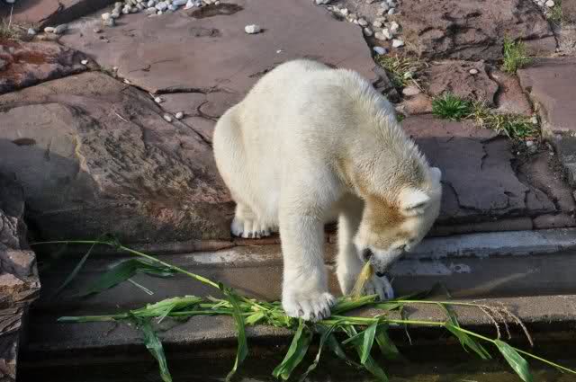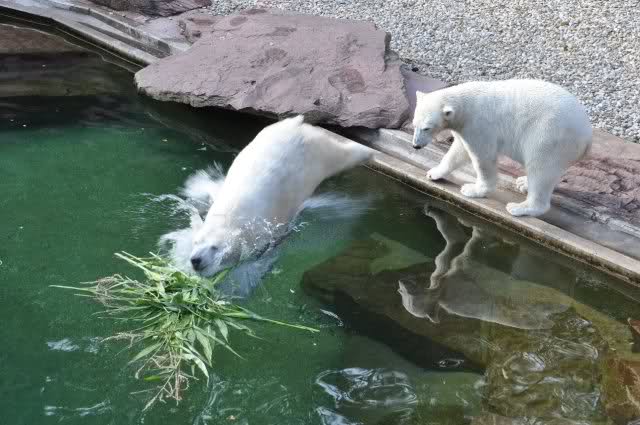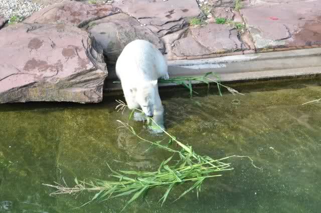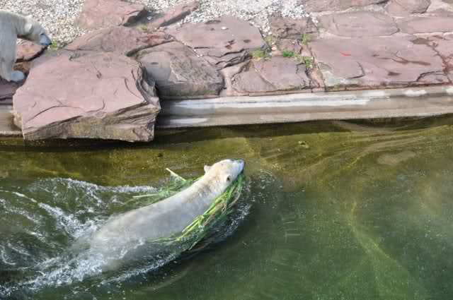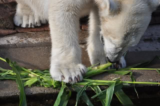 Als Zusatzverpflegung gab es Mais. Über den machten sich beide mit großer Begeisterung her, allerdings wollte Flocke nicht ins Wasser sondern versuchte, vom Rand aus einige Halme zu ergattern. Da Rasputin etliche Halme in Ufernähe verlor hatte sie damit auch Erfolg.