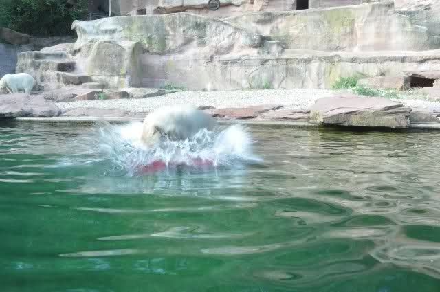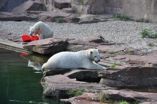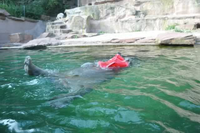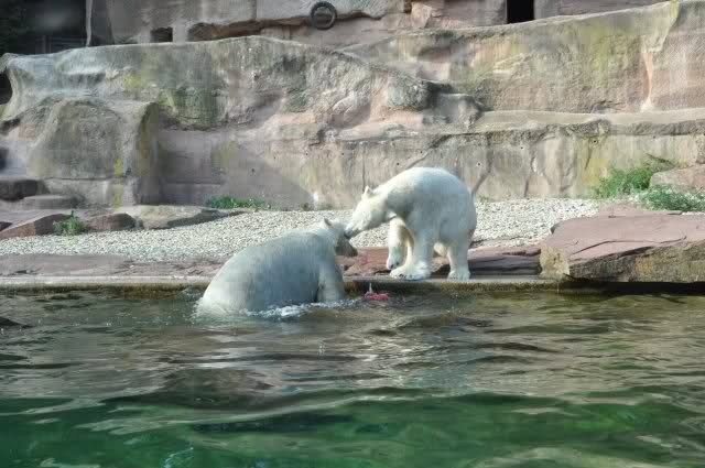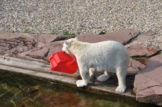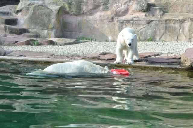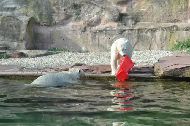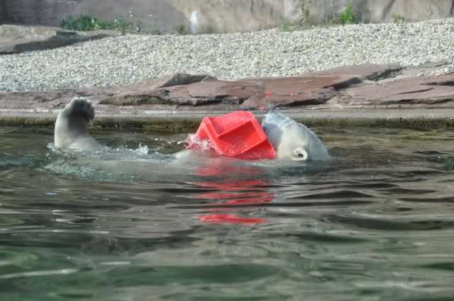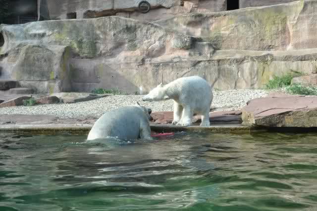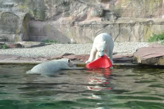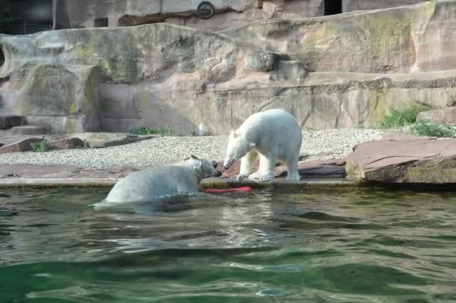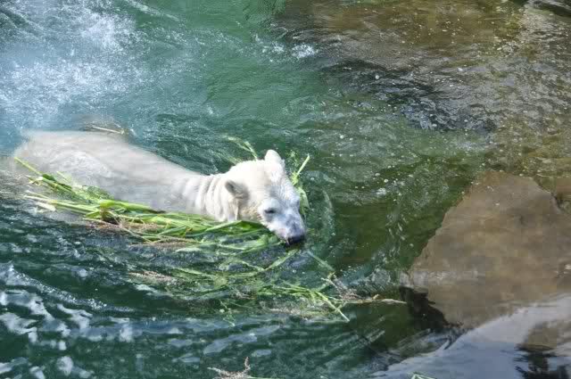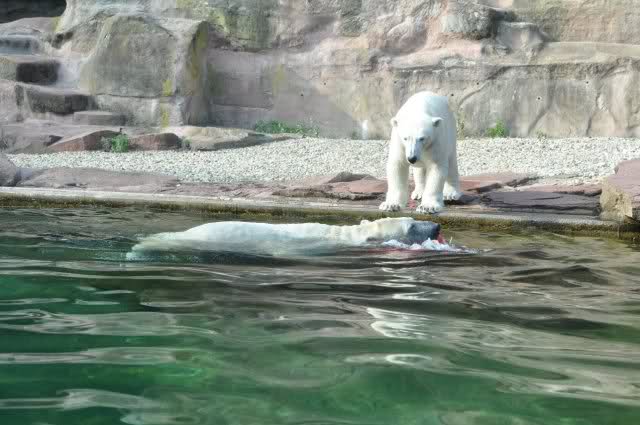 Als Zusatzverpflegung gab es Mais. Über den machten sich beide mit großer Begeisterung her, allerdings wollte Flocke nicht ins Wasser sondern versuchte, vom Rand aus einige Halme zu ergattern. Da Rasputin etliche Halme in Ufernähe verlor hatte sie damit auch Erfolg.