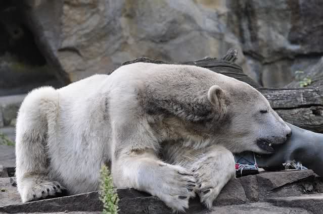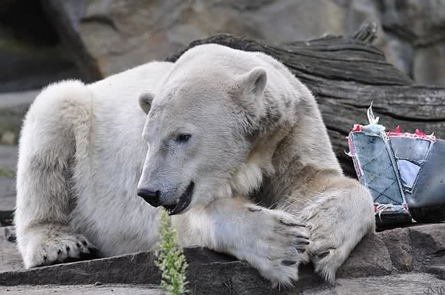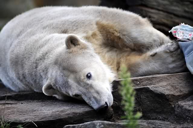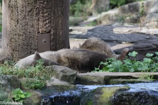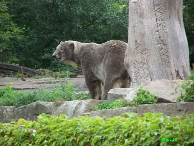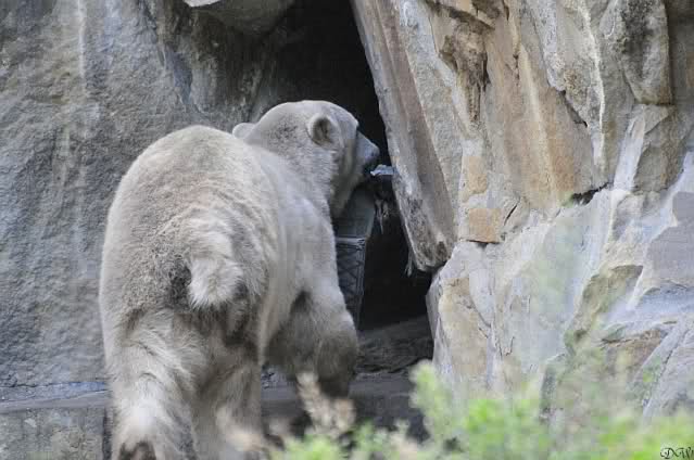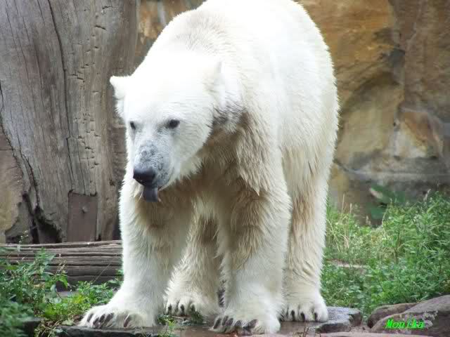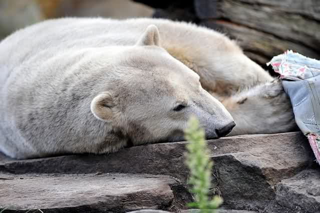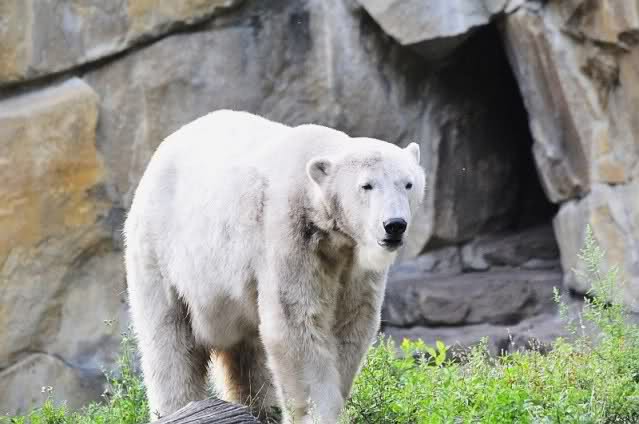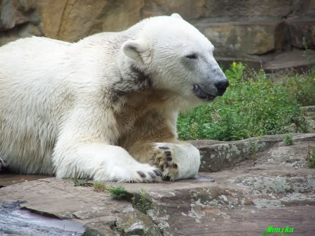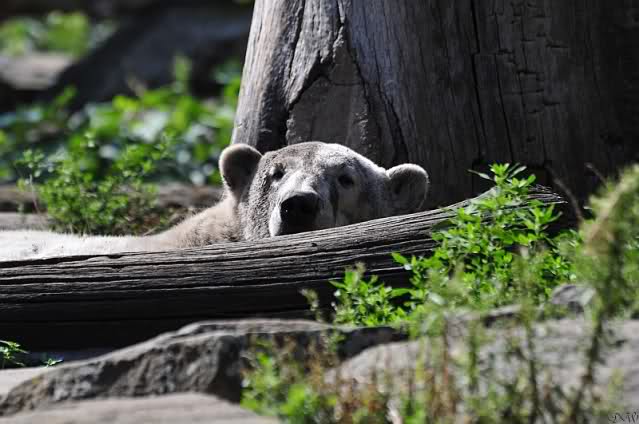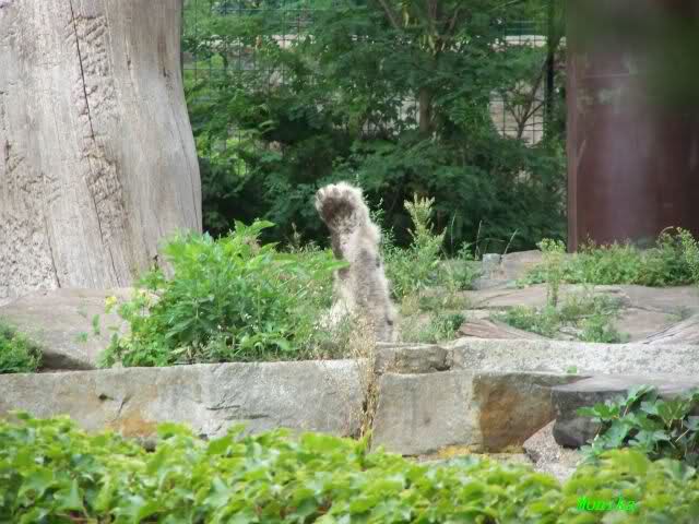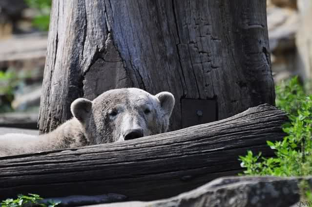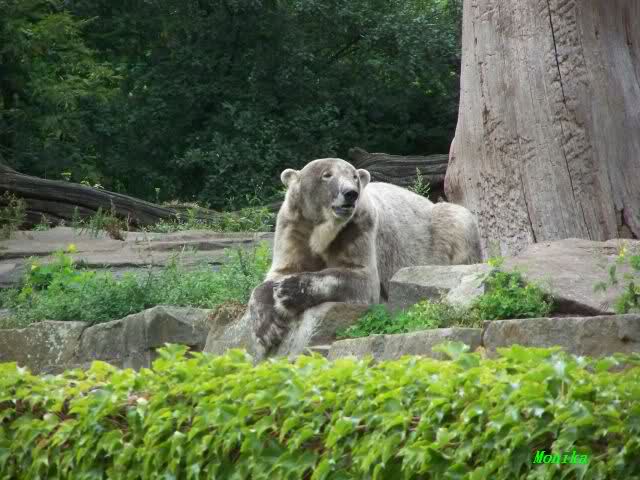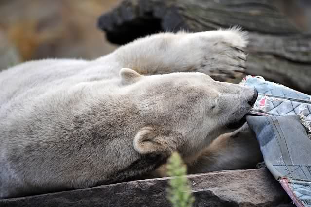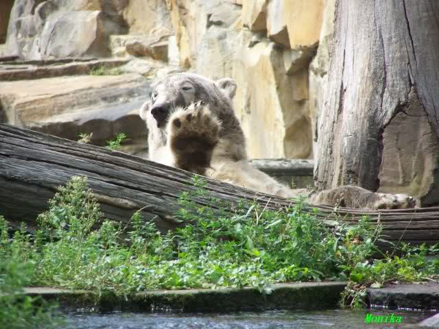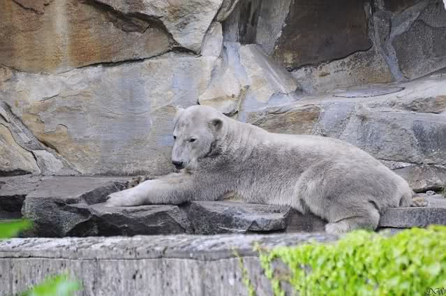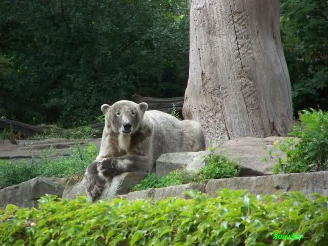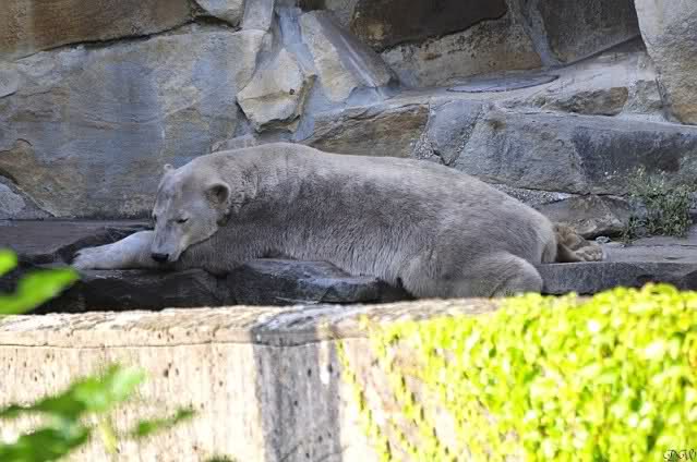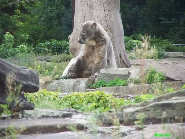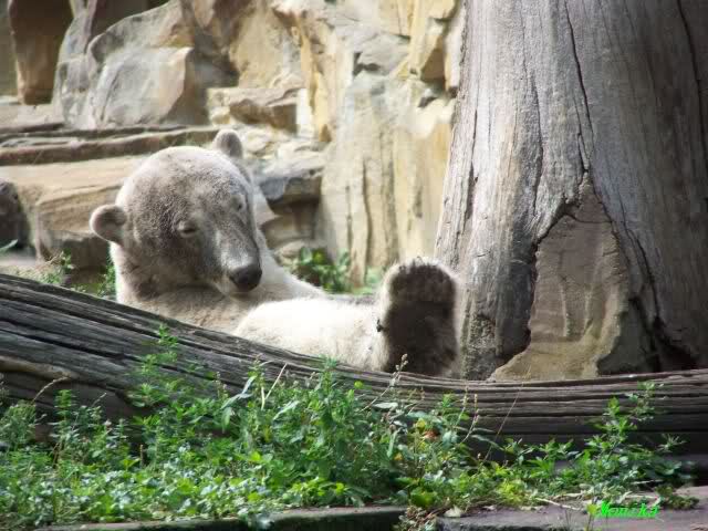 Natürlich gab es wieder Knutrufe aber der Gipfel war ein Ehepaar mit Kindern!! die mit einem Ring auf den Zaun klopften. Natürlich schreckte Knut völlig verschlafen auf. Er wollte dann in seiner Höhle weiter schlafen, was nicht ging, weil die Tür zu war. Also legte er sich vor die Höhle und versuchte weiter zu schlafen. Mir wurde heute gesagt, daß Knut wegen einer Wurmkur auf Diät ist. Ich weiß nicht wie es ihm heute geht. Ich bin gegen Mittag gegangen.