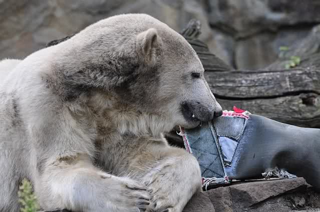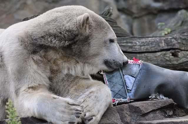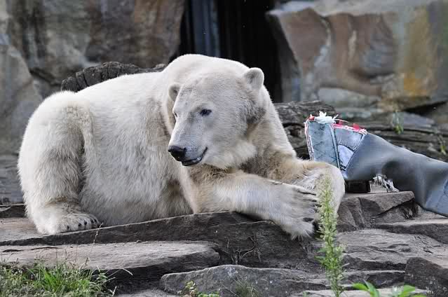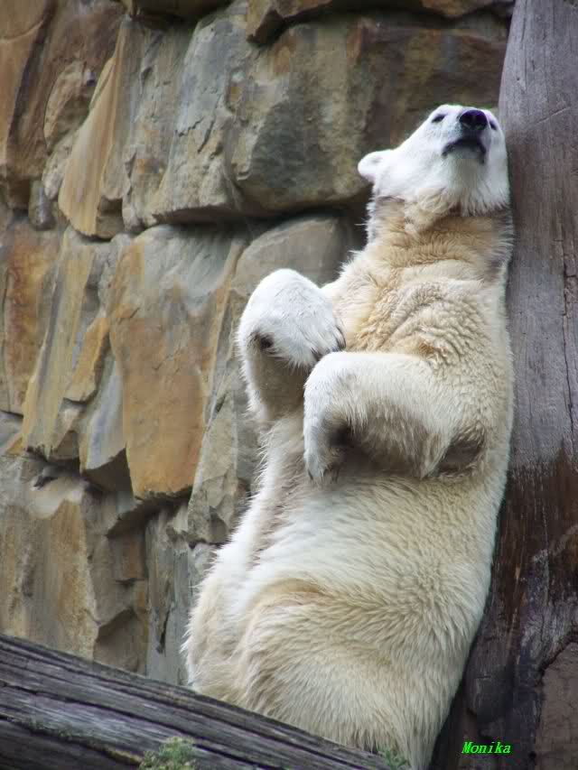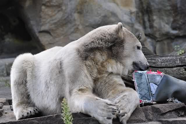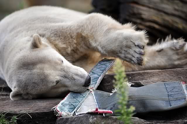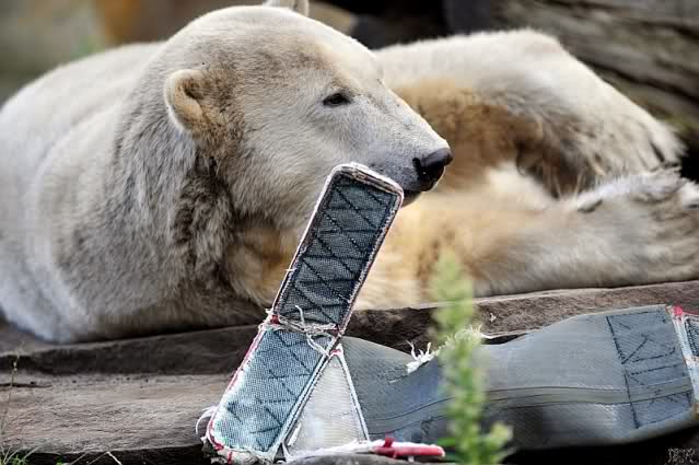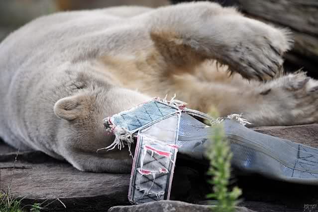 Liebe Knut-Freunde, liebe Fotografen/innen, was für zauberhafte Fotos von unserem Knut, was für besonderes, schönes Tier. Hoffentlich hat das Huhn das Wegfliegen geschafft, jetzt wo Knut auf Diät ist, bloß schnell weg denn die Jagdinstinkte funktionieren bei ihm wunderbar, genau wie die Dummheit bei einigen Menschen, die sich so gar nicht weiterentwickeln. Bei der Eröffnung des Zoos vor 165 Jahren mußten die Berliner ermahnt werden, da sie die Tiere neckten und ärgerten, um sie zu Aktionen zu animieren, nach dem Motto: Ich habe bezahlt, nun muß mir was geboten werden! So piekten die Besucher die Tiere mit Regenschirmen und warfen Steine o. Stöcke nach den Tieren. Die Gründe hat man im "bäuerlichen Verhalten" der meisten Menschen gesehen. Na ja, einige sind so geblieben und leider geben sie ihren Kindern ja wieder das schlechte Vorbild, so dass sich das Verhalten fortsetzt.