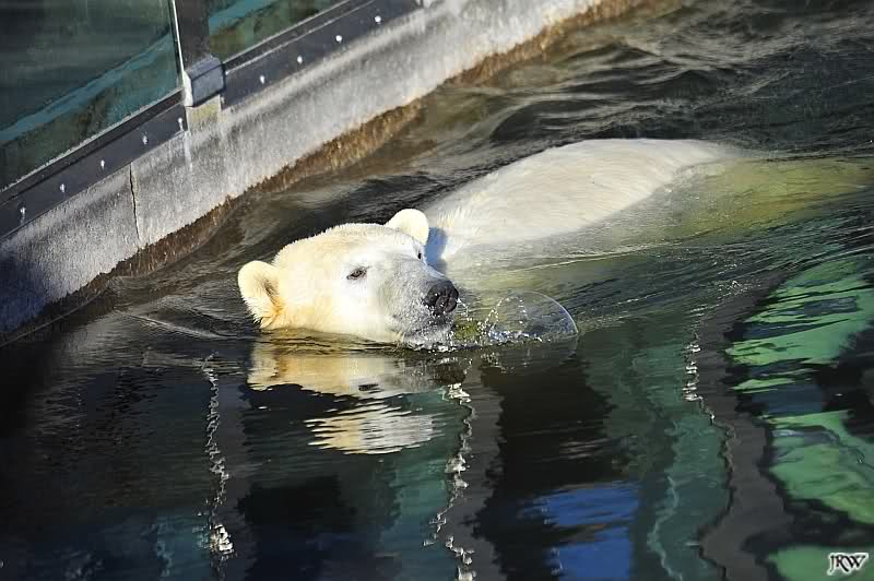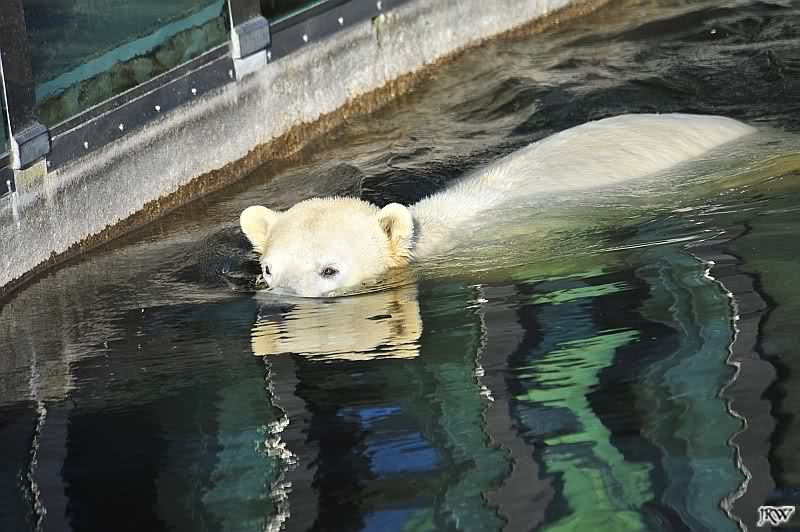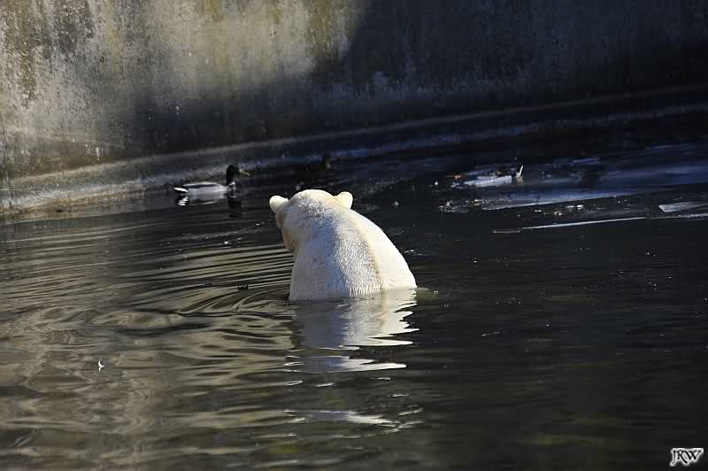 Dem sehr ruhigen Tag bei den Eisbären folgte ein furioses Spiel im Wasser. Knut wartete bis die Großen drinnen waren und ging dann sehr bedächtig über die Anlage. Er schnüffelte jeden Platz ab, an denen die Mädels gelegen hatten. Dann überlegte er kurz und ging nach einigem Zögern ins Wasser. Er spielte Eisbrecher auf der linken Seite des Geheges, jagte die Enten, sprang lebensfroh ins Wasser. Er kletterte auf die Insel und sprang von dort, schwamm auf die andere Seite und holte sich Beschäftigungsmaterial. Von der Baumfällaktion hat er einen schönen Baumstamm, fand ein Stück Fell im Graben, das ihn kurz interessierte, spielte kurz mit seinem T-Shirt und tobte wie ein Wilder durch das Wasser. Hin und wieder zeigte er sich mit seinen Dingen an der Scheibe und die Besucher (viele von auswärts) waren hell begeistert.