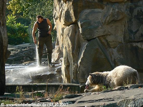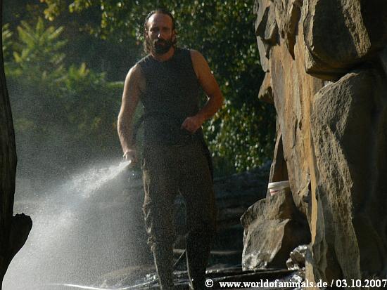 Knut looked to Thomas who did clean the enclosure in the neighborhood / Knut schaute zu seinem Ziehpapa, der nebenan die Anlage säuberte.