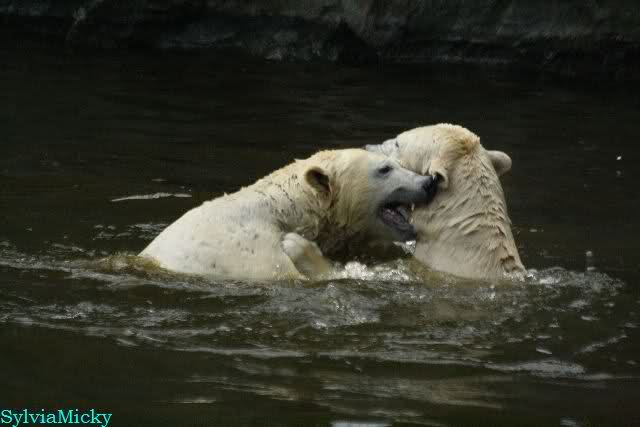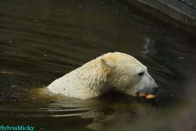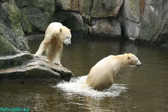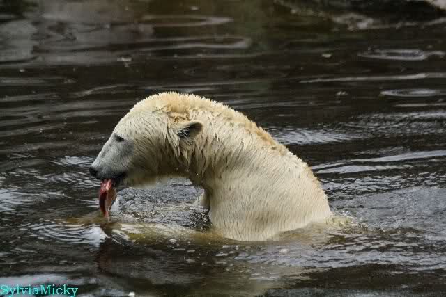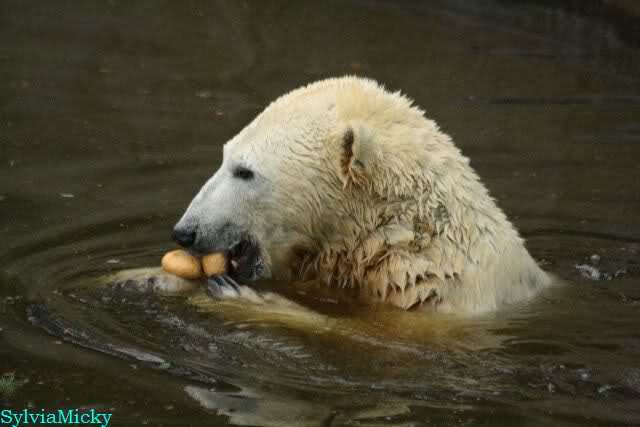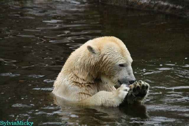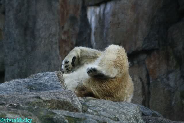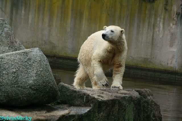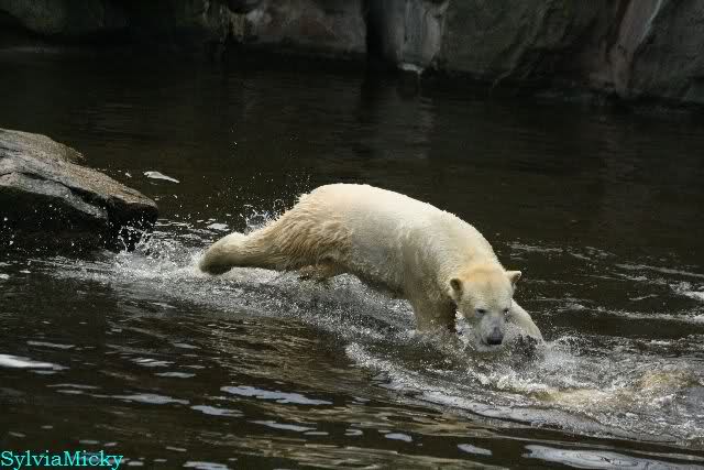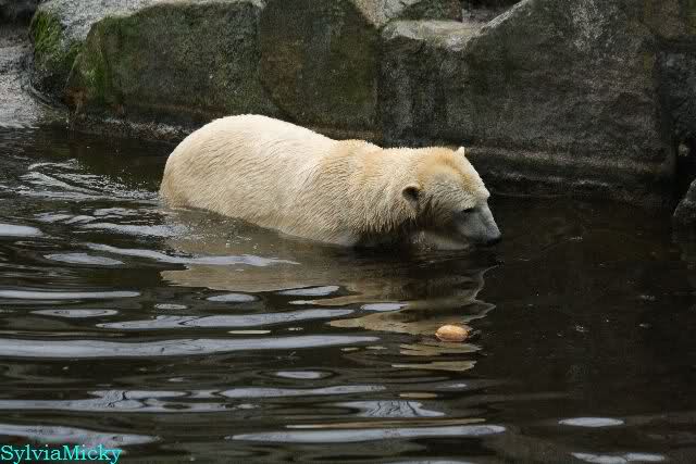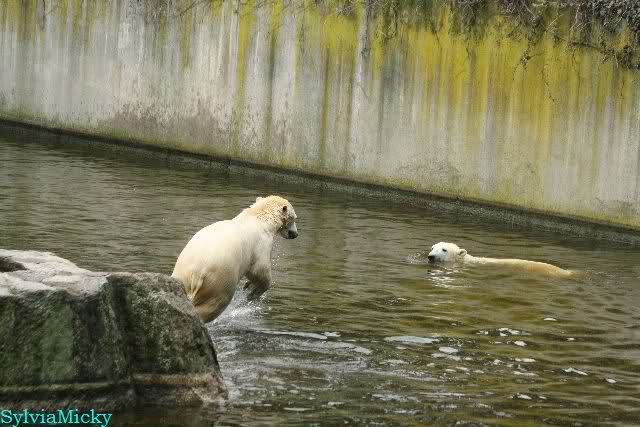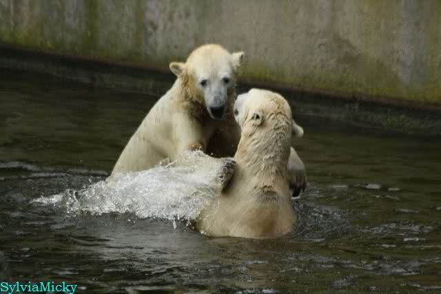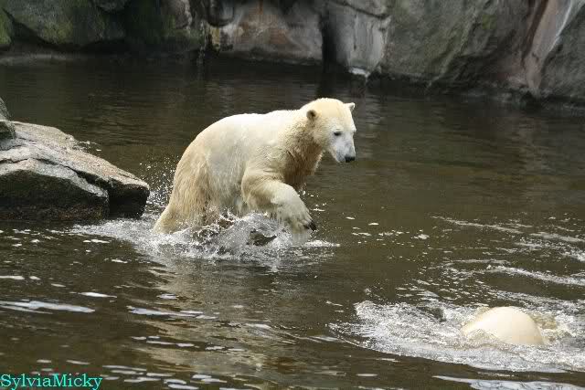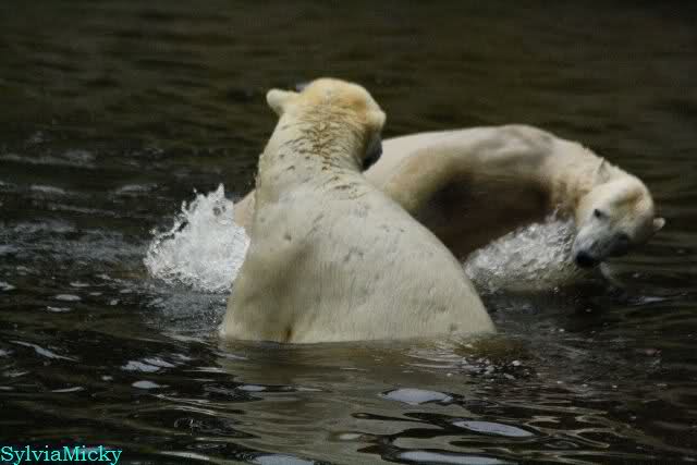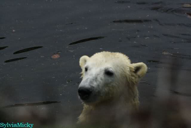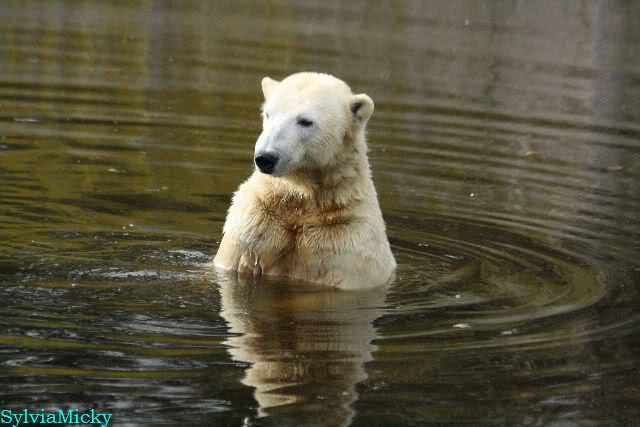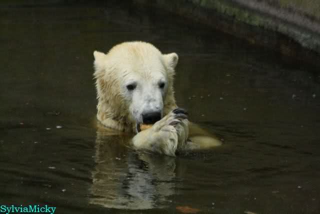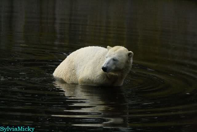 Wunderschöne Bilder, liebe Sylvia, Danke dafür! Es ist immer wieder schön, das man mit so tollen Bildern und Berichten versorgt wird, wenn man selbst nicht in den Zoo kann. Ja, ja, diese Harmonie ist einzig artig. Da hast Du ja mal wieder großes Glück gehabt, Knut und Tosca im Wasser. Gestern, weißt Du noch? Ach, wenn ich daran denke, schlägt mein Herz wieder ganz schön heftig. Diese kleine Dampfwalze, so was von hinterlistig! Schön, das Du gestern noch einmal nach unserm Knut geschaut hast. Als ich noch einmal nach ihm schaute, lag er immer noch in der hintersten Ecke und wusste nicht, wie er sich hinlegen sollte, und wohin mit seinem Kopf, echt traurig. Hätte ich 3 Wünsche frei, würde ich mir für unsere Eisbärchen wünschen "Schöne, weiche Liegemulden" "Eisbär-Beschäftigung" (da gibt es doch diese wunderschönen Kugeln, ein so genanntes Aussidog usw. usw.) und "Baumstämme" zum schubbern und Krallen wetzen!!! Sind das wirklich so außer gewöhnliche Wünsche??? Meinst Du, wenn man möchte, könnte man sie erfüllen? Das wäre schön!!! KNUTE NACHT_KNUT WELT