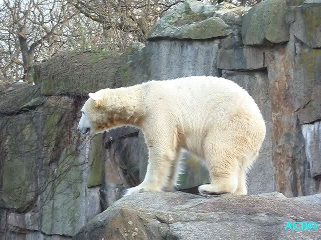Knut lief über die Anlage, sie stand vor der Höhle und blieb stehen. Ich glaube sie war gestern so griesgrämig, weil sie die Nacht davor draußen verbracht hat. Eine Stammbesucherein meinte, vielleicht hat sie vorgestern am Spätnachmittag den Tierarzt gesehen oder gerochen und wollte deshalb nicht rein. Klingt logisch.