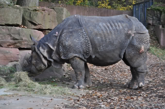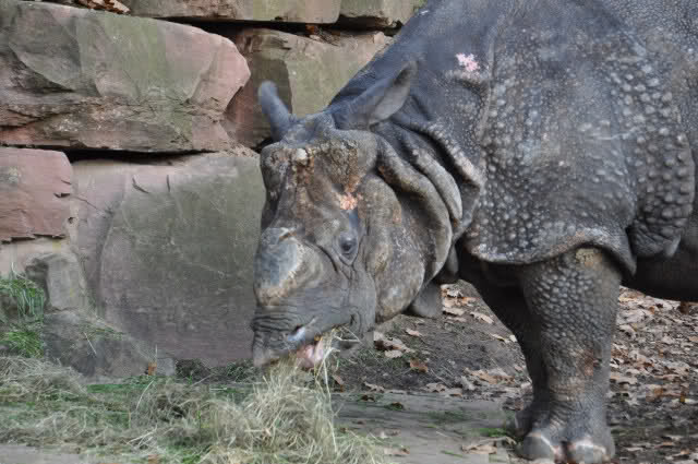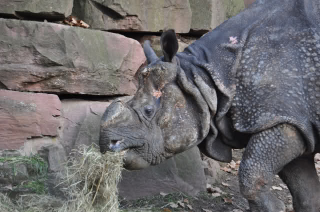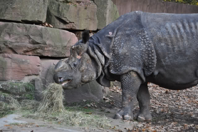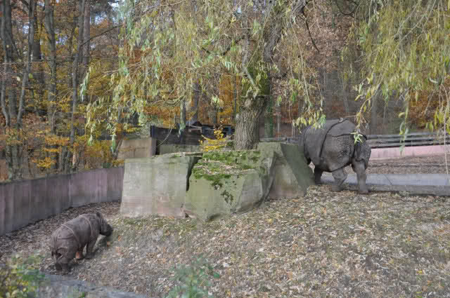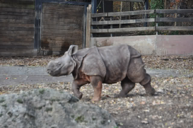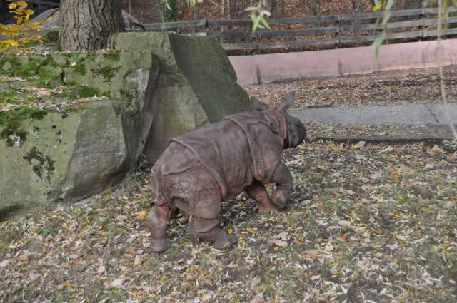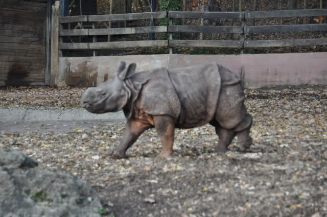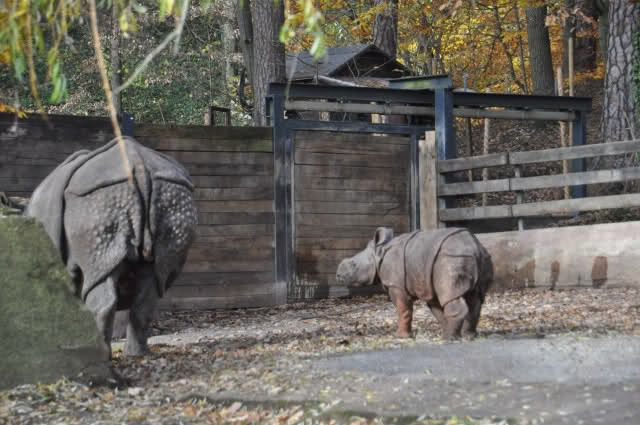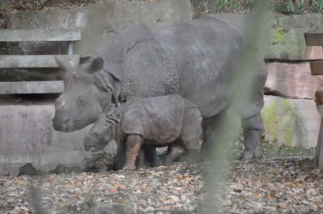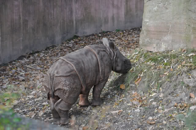 Auf dem Weg zu Ausgang schauten wir noch einmal zum Nashörnchen. Das war schon im Haus, allerdings in einem Gatter, wo man es sehen konnte. Mutter Nashorn futterte und das Kleine ging an die Milchbar.