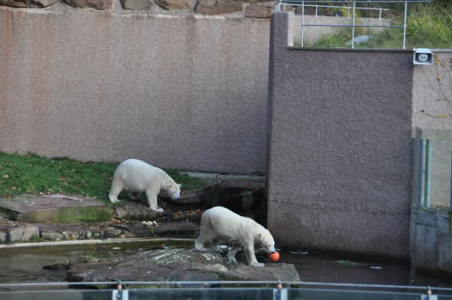 Später gingen wir noch einmal zu den Bärchen. Die ließen es sich auf ihrer Anlage gut gehen und spielten u.a. mit einem Fass, das an einem Seil hing.