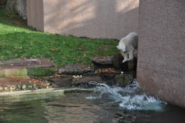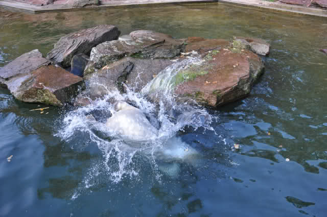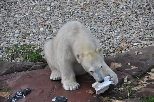 Bei der Fütterung gab es jetzt auch bei den Eisbären, so wie bisher bereits bei den Seelöwen, Erklärungen von einem Pfleger; dafür gibt es jetzt extra eine Lautsprecheranlage. Die Fütterung wurde vom Dach des Stalles aus vorgenommen.
