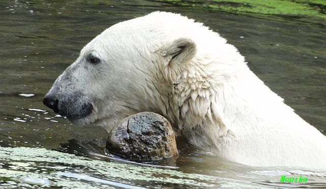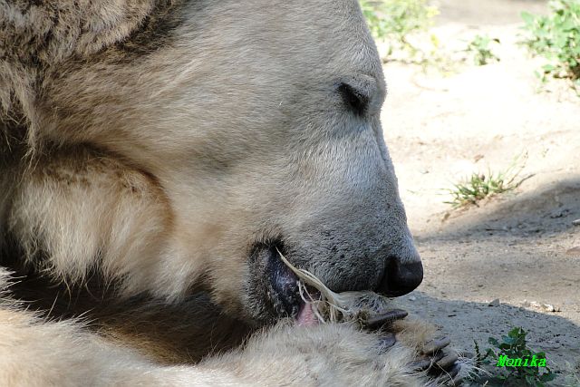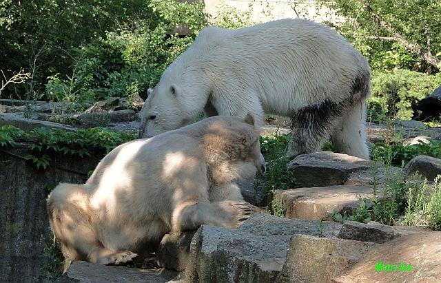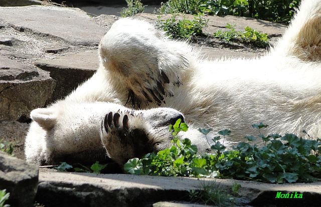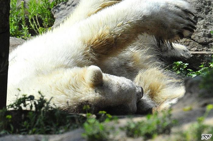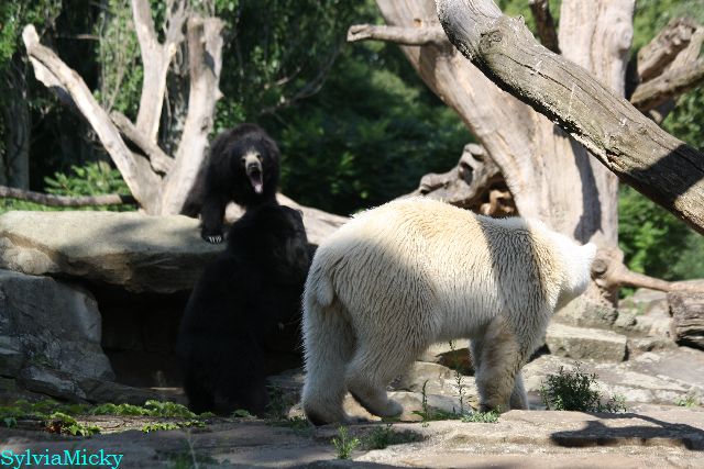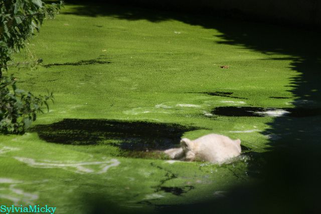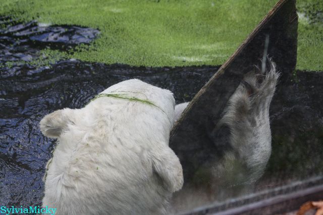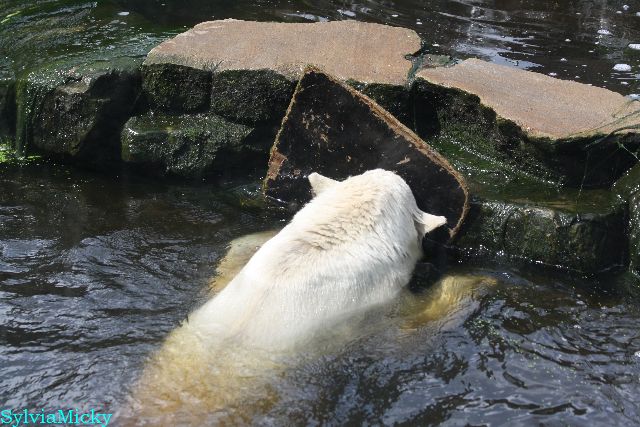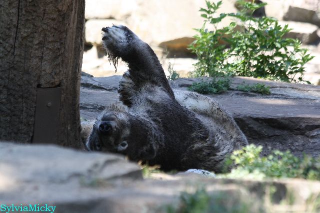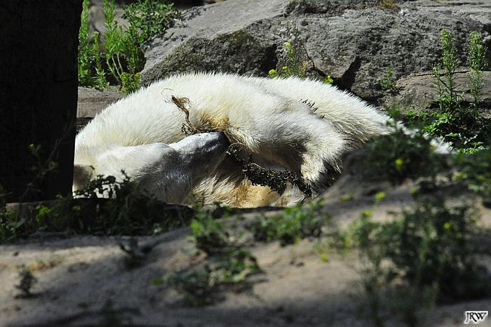 Der Möhrchennotstand schien heute beendet zu sein. Sehr zur Freude beider Bären warf MR netterweise wieder Möhrchen auf die Anlage. Somit gab es keinen Streit zwischen den Beiden. Gianna suchte alles ab um seine Möhren und Äpfel zu finden und Knut fraß derweil ihre Möhren. Danach färbte sich Gianna ein und ein sauberer Knut spielte sich eine Weile in den Schlaf.